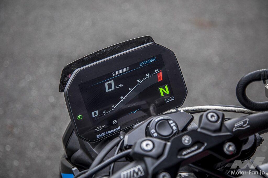 ライディングモードをロードの位置にしてスタートします。210psを発生する高回転高出力型の並列4気筒エンジンながら、低回転でのクラッチミートにも不足のないトルクを発生し、そこから常識的なアクセル操作をすればスムーズに加速してくれます。一般道ではせいぜい3000rpmも回していれば事足りてしまうので、M1000Rの高出力エンジンにとってははなはだ役不足ですが、ポテンシャルを体現するためにはサーキットに持ち込むしかないので仕方ありません。それよりも、これほどの高性能エンジンでありながら、低速から普通に使えてしまうフレキシビリティなエンジン特性を実現しているところに、BMWの高い技術力を見る思いでした。そうした技術の中にはもちろん、電子制御も含まれているのですが、随所に導入されている電子デバイスがライダーの操作、走りを堪能させる安定した走行性をサポートしてくれています。ちなみにライディングモードに関しては、レイン、ロード、ダイナミック、レース、レースプロが選択でき、これによってトラクションコントロール、ウィリーコントロール、スロットルレスポンス、コーナリングABS、エンジンブレーキコントロール、ブレーキスライドアシスト、サスペンションダンピングなどが最適な状態に設定されます。 全体にスピードが低く、信号によるゴー&ストップが多い都心部の道路も、高性能なこのハイパーロードスターはイライラを募らせることなく走ってくれました。この事実に僕は感心しました。
