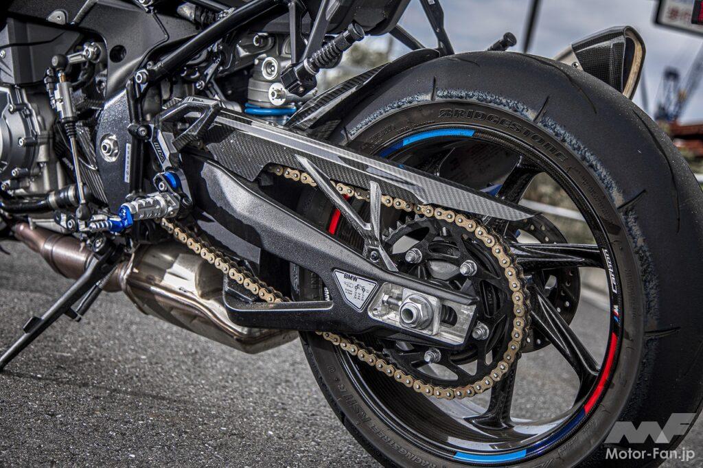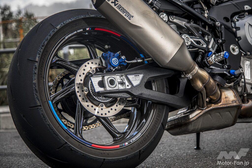 ●エンジン タイプ油冷/水冷4気筒4 ストローク並列エンジン、1気筒あたり4バルブ ボア×ストローク80 mm x 49.7 mm 排気量999 cc 最高出力154 kW (210 PS) / 13,750 rpm 最大トルク113 Nm / 11,000 rpm 圧縮比13.3 : 1 点火 / 噴射制御電子制御インジェクション、可変インテークマニホールド長 エミッション制御制御式3元触媒コンバーター 排ガス基準EURO 5 ●走行性能・燃費 最高速度200 km/h 以上 (280 km/h) WMTCに準拠した1Lあたり燃料消費率(1名乗車時)15.62km/L WMTCに準拠したCO2排出量149 g/km 燃料種類無鉛プレミアムガソリン(ハイオク) ( 最大5%エタノール、E5) 98 ROZ/RON 93 AKI ●電装関係 オルタネーター450 W バッテリー12 V / 5 Ah、リチウムイオン、メンテナンスフリー ●パワートランスミッション クラッチ湿式多板クラッチ(アンチホッピング)、自己倍力機能付き ミッション常時噛み合い式6 速トランスミッションをエンジンブロックに内蔵 駆動方式チェーンドライブ トラクションコントロールBMW Motorrad DTC ●車体・ブレーキ フレームアルミニウム製ブリッジタイプフレーム、エンジンをフレームの一部として使用 フロントサスペンション倒立式テレスコピックフォーク(45 mm 径)、電子制御式ダイナミックダンピングコントロール(DDC)、調整式スプリングプリロード、ダンピング範囲を電子式に個別設定可能 リアサスペンションアルミニウム製ダブルスイングアーム、コイルスプリング付きセンタースプリングストラット、手動調整式スプリングプリロード、電動調整式リバウンド/コンプレッションダンピング サスペンションストローク(フロント / リア)120 mm / 117 mm 軸距1,455 mm キャスター97.6 mm ステアリングヘッド角度65.8° ホイールアルミニウム鍛造ホイール (M カーボンホイール OE 装備:カーボンホイール) リム(フロント)3.50" x 17" リム(リア)6.0" x 17" タイヤ(フロント)120/70 ZR 17 タイヤ(リア)200/55 ZR 17 ブレーキ(フロント)ダブルディスクブレーキ、直径320 mm、4 ピストンブレーキキャリパー ブレーキ(リア)シングルディスクブレーキ、直径220 mm、1 ピストンフローティングキャリパー ABSBMW Motorrad ABS Pro ●寸法、重量 シート高、空車時830 mm (M スポーツローシートOE 装備:810 mm、M スポーツハイシートOE 装備:850 mm) インナーレッグ曲線、空車時1,835 mm (M スポーツローシートOE 装備:1,815 mm、M スポーツハイシートOE 装備:1,858 mm) 燃料タンク容量16.5 L リザーブ容量約4L 全長2,085 mm 全高1,110 mm 全幅850 mm 車両重量(ドイツ工業規格DIN)199 kg 1) 車両重量(日本国内国土交通省届出値)200 kg 2) 許容総重量407 kg 最大積載荷重(標準装備の場合)210 kg 1) ドイツ工業規格DIN 空車時、走行可能状態、燃料満載時の90%、オプション非装備 2) 日本国内国土交通省届出値、燃料100%時