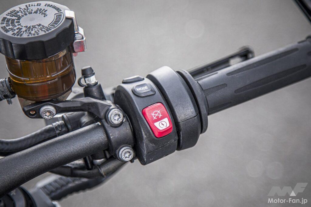 フロントにニッシン製、リアにブレンボ製のディスクブレーキを装備していますが、とにかく制動力が高く、コントロール性が良かったのも印象的です。タイヤのグリップ性の良さももちろんありますが、パッドがローターに接した瞬間から制動が始まっているんじゃないだろうかというくらい、指1本でのレバー操作でもググっとブレーキが効いてきます。周囲の交通状況から安全を確認したうえでわざと力強くレバーを握ったりペダルを踏み込んだりしてみたのですが、ABSが作動してもちろんタイヤがロックすることはなく、しかもABSの作動フィーリングがナチュラルでした。