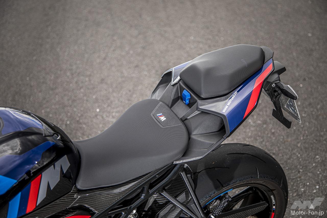 シートは前後に段差を設けたレーシーなデザイン。表皮には「M」のロゴがあしらわれていて、スペシャルなモデルであることをアピールしています。ユーザーにとってもうれしいでしょう。シート高は830㎜で、平均的な体格の日本人ライダーなら両足のつま先がちゃんと着けられます。それだけじゃありません。M1000Rの車重はなんと200㎏に収められているのです。これは600㏄クラスと同程度なので、取り回しの良さはリッターマシンとは思えません。これなら市街地をはじめとしたストリートユースに十分に使用することができます。