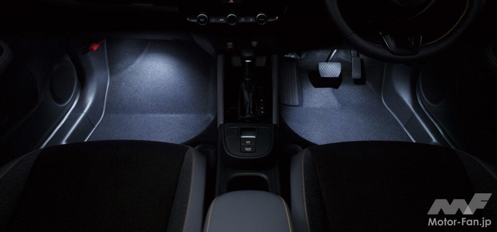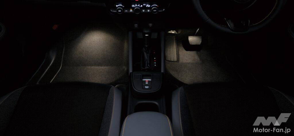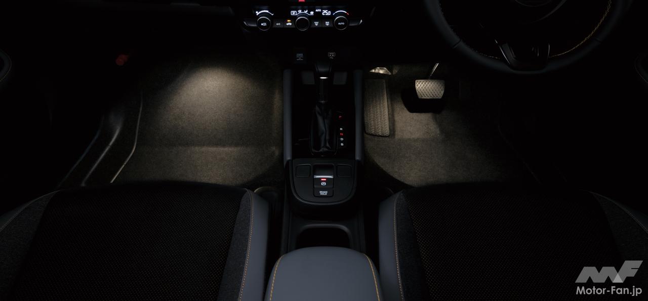 また、ドア開閉時にFITのロゴが足もとを照らす「パターンプロジェクター」や、キャンドルホワイト/ブルーから選べる「フットライト」などのイルミネーションアイテムが、上質で華やかなイメージを演出する。