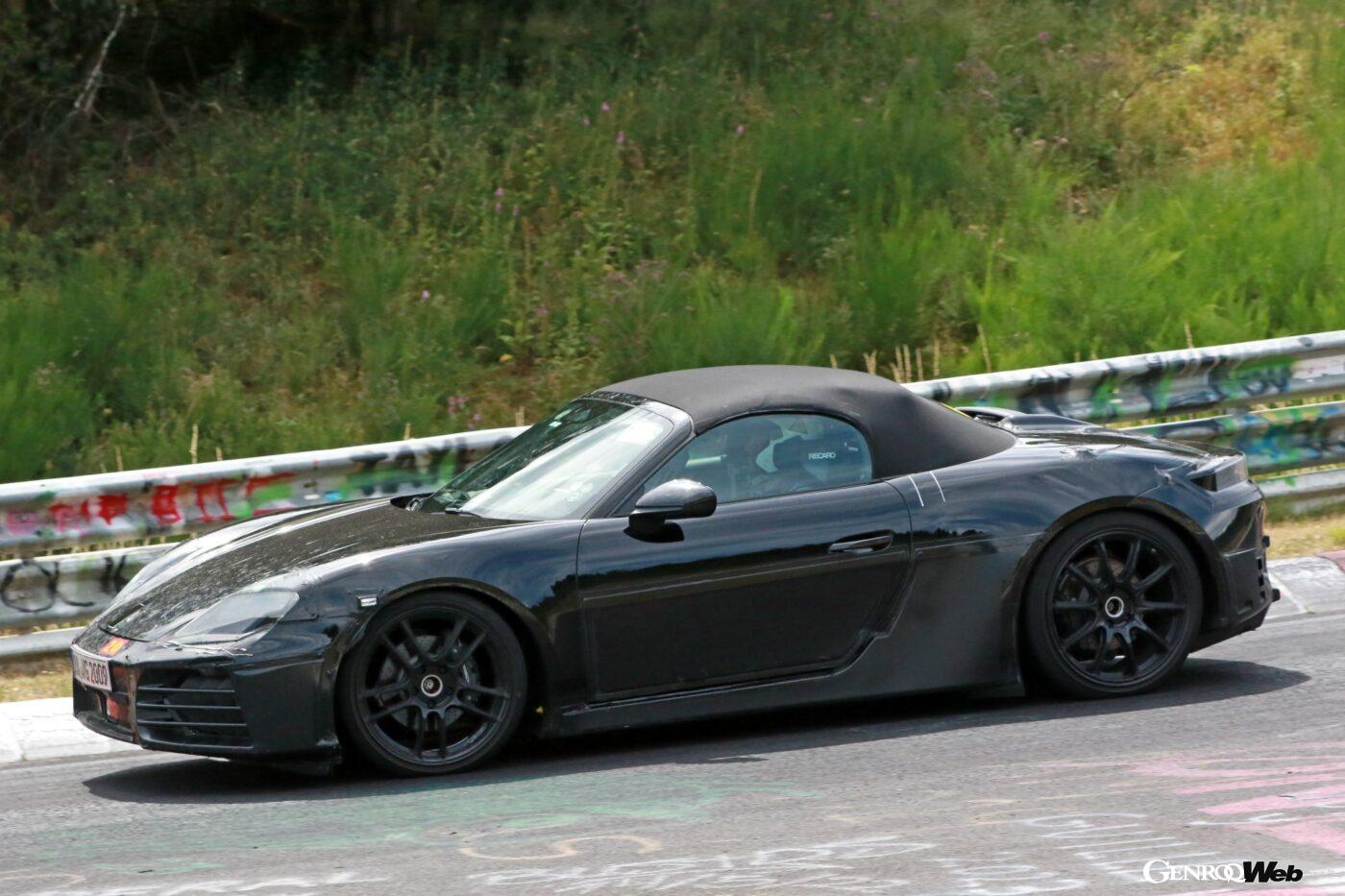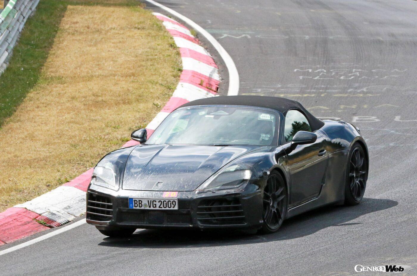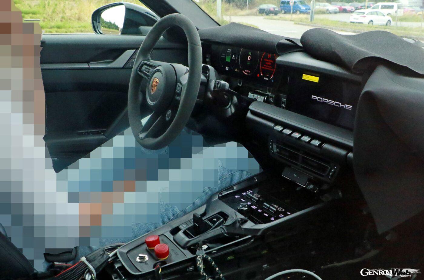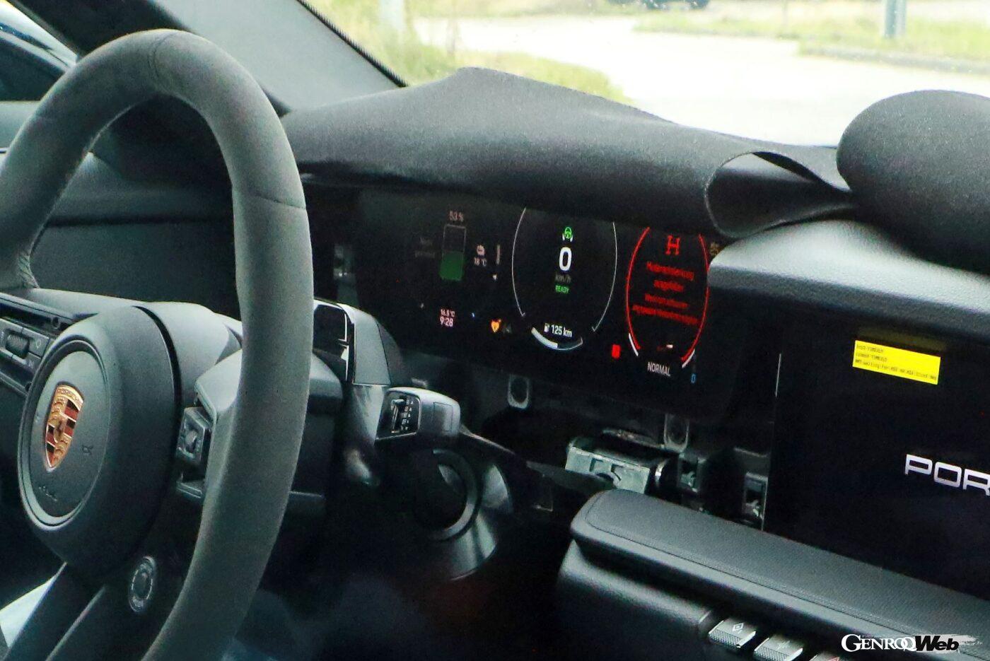 理由は不明だが、この「ポルシェ ボクスター」のテスト車両はダッシュボードの大部分からカバーが外されている。ステアリングホイールの後ろにフルデジタルのメータークラスターが配置され、デュアルスクリーンレイアウトになっている。センタースクリーンより少し上に位置し、情報がグラフィカルに表示されているのがよく分かる。