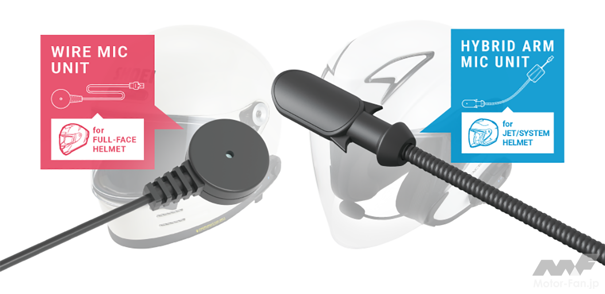 B+COM TALK は「ハイブリッドアームマイクUNIT」と「ワイヤーマイクUNIT」の2種類あり。オープンフェイス型・ジェット型・システム型ヘルメットには「ハイブリッドアームマイクUNIT」。フルフェイスヘルメットには「ワイヤーマイクUNIT」の使用がおすすめ。