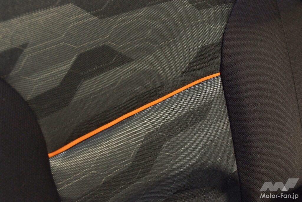 インテリアはエアコンの吹き出し口やドアハンドル付近、シートにオレンジの差し色を追加。シートはさらに独特のカモ柄を採用することでアクティブな雰囲気を演出している。