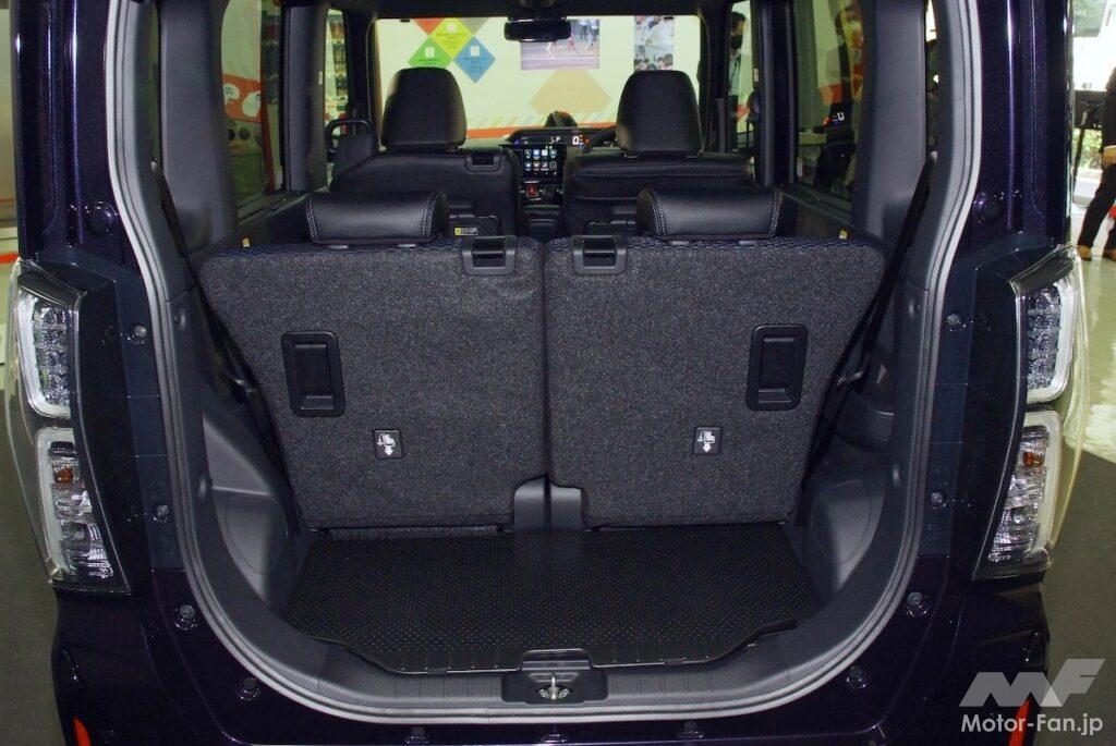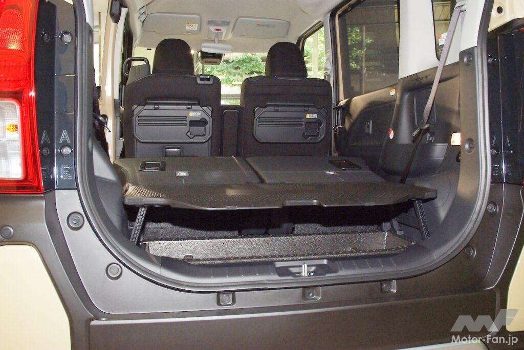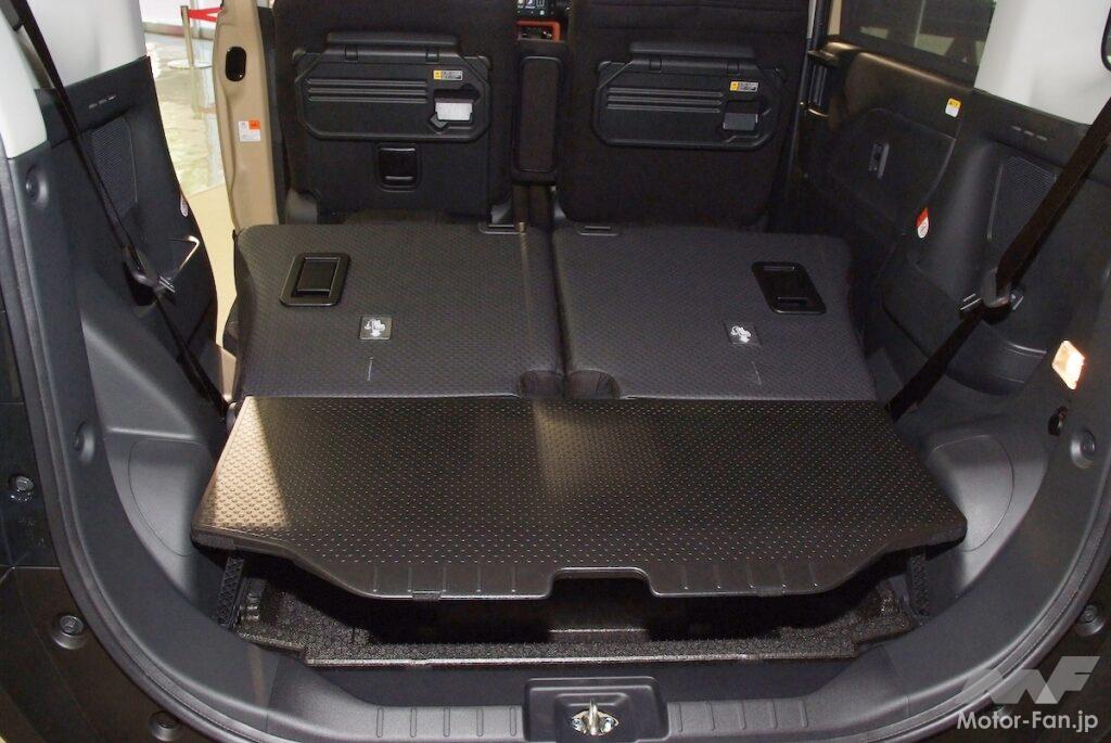 さらに、上下2段調節式デッキボードは脚を出すことでリヤシートとフルフラットな荷室を生み出すことができ、箱物をフラットに積むことができる。アウトドアギアやキャンプ用品を詰め込んだボックスをそのまま詰むことができるのは大きな魅力である。助手席フルフラット機能を駆使すれば、車中泊もできる広大な空間を作り出すことも可能なのだ。