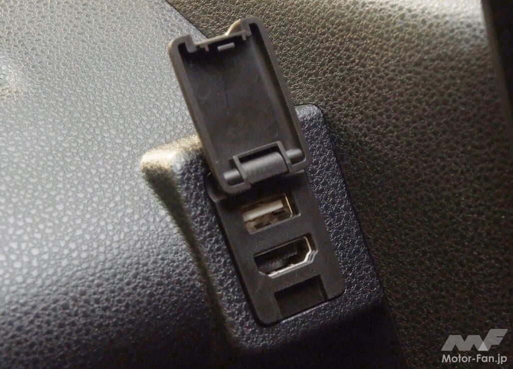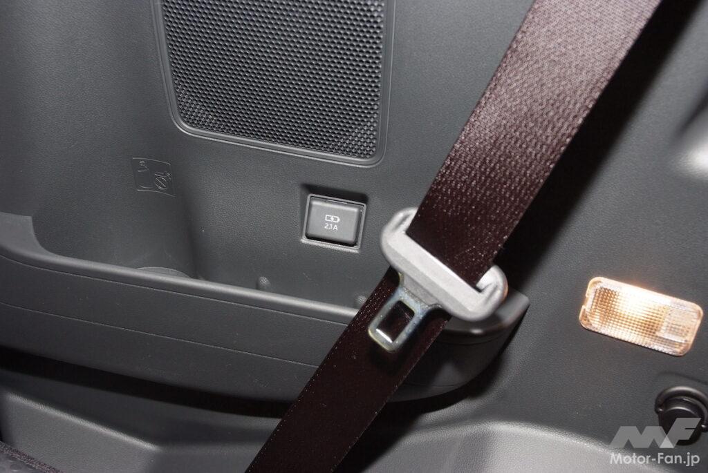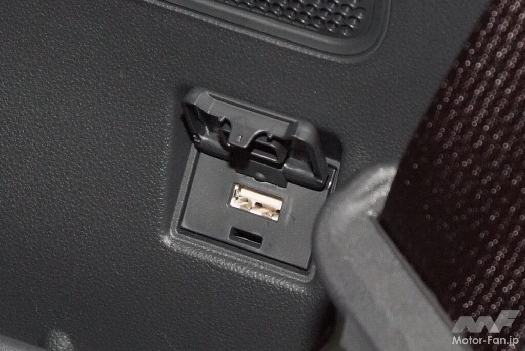 後席右側のサイドボックス上にUSBソケット(タイプA)を設置。出力は2.1Aとスマートフォンの充電やLEDランタンなどのUSB機器の給電が可能な容量を確保しており、車中泊やキャンプなどでの電源確保に役に立つ。