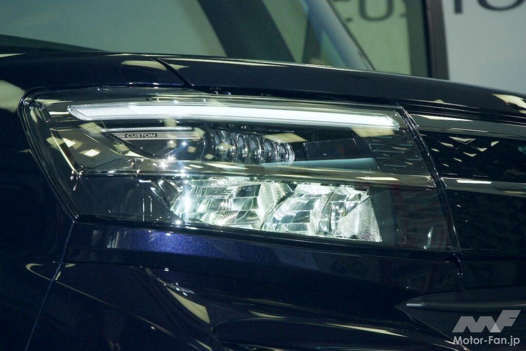 カスタムのヘッドライトはオートレベリング機能も備えたフルLEDで、乗車人数や積載状況で変わる照射軸の上下方向を自動調節してくれる。ライトユニット上下3段で、上からポジション、ハイビーム、ロービームの順になっている。