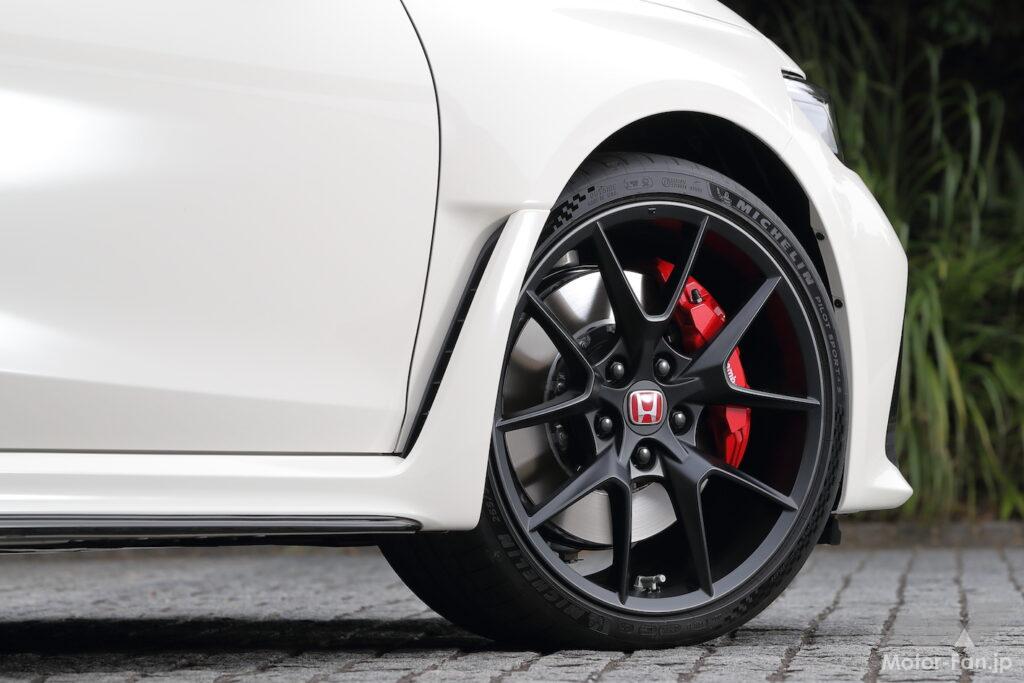 シビックタイプRは、先代タイプRの20インチからの最適化を図り19インチにサイズダウン。異例なのは前後「265」というタイヤ幅だ。これはCセグメントハッチバックとしては異例のサイズと言える。タイヤはミシュラン パイロットスポーツ4Sを履く。