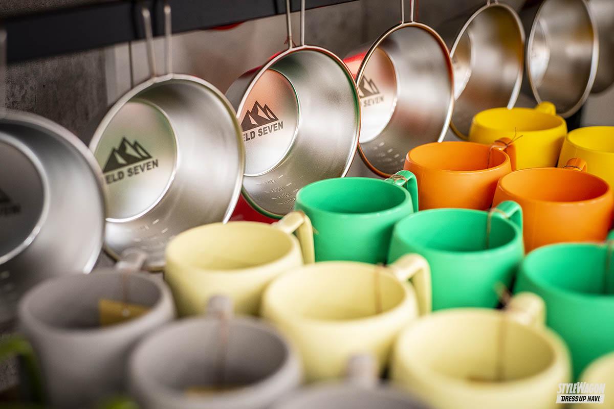 フィールドセブンのオリジナルグッズも豊富に揃う。シェラカップやマグカップなど実用的アイテムから、ペグ打ちの角度を示したお洒落なTシャツ、ステッカーなど様々だ。