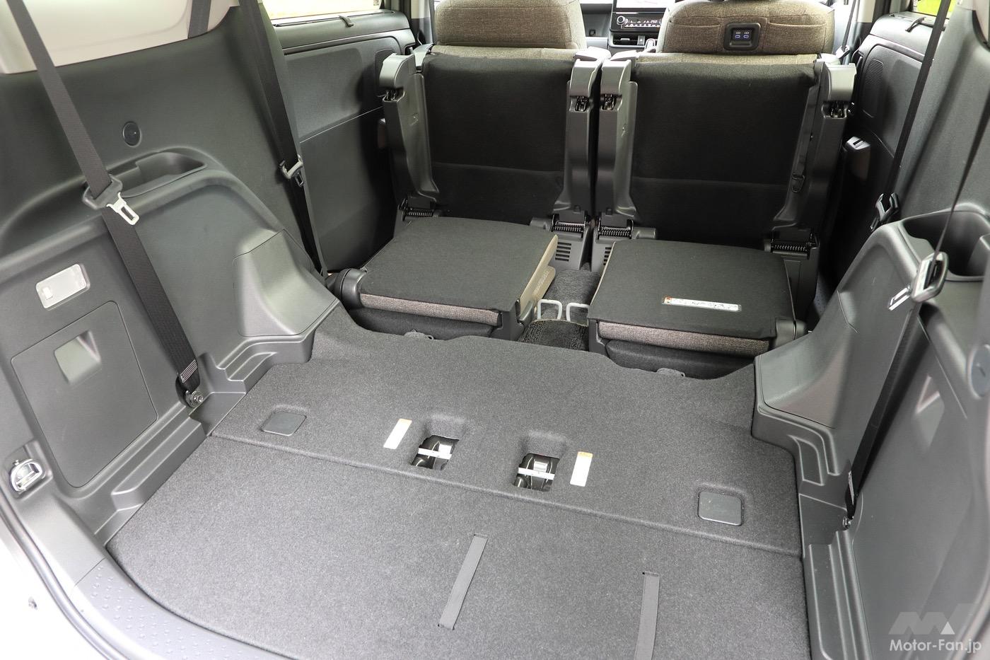 また、3列目は5対5分割式なので、長い荷物を積む際や荷物が増えた時でもサードシートを片側倒すだけでも奥行きは増す。さらに、最大時は、セカンドシートをタンブルさせた状態で、荷室フロア高505mmという地上からの開口高の低さを活かして、自転車などの大きな荷物やキャンプ用品なども多く積み込めそうだ。