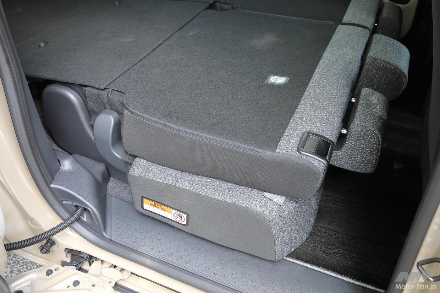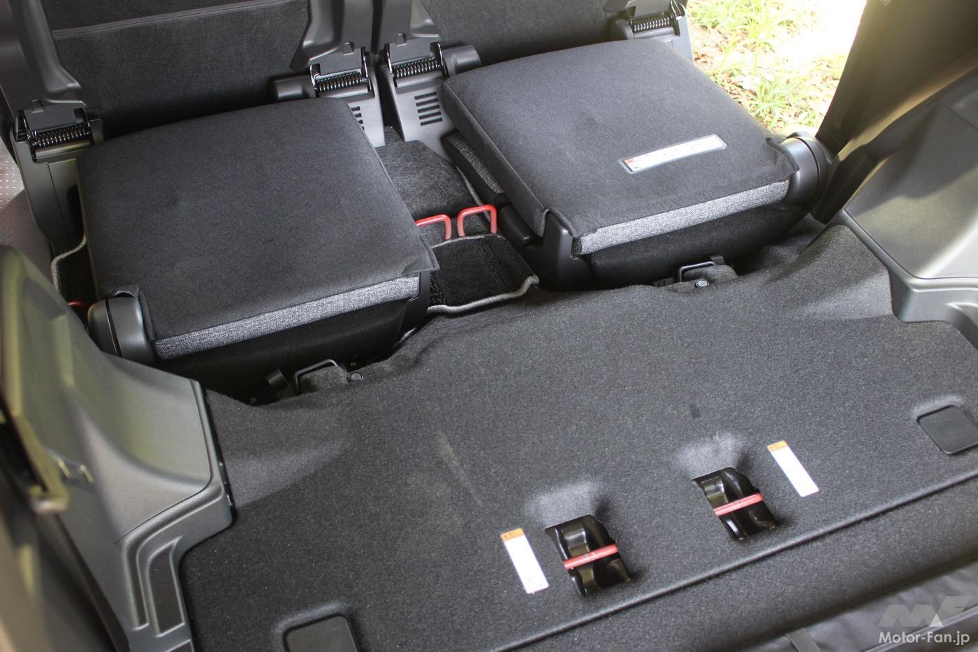 サードシートは、床下に格納するダイブダウン機構を採用した。床下格納する際は、スライド可能な2列目を折りたたみ(タンブル)させてから、サードシートの背もたれを前倒し、さらに床下に格納する。慣れれば容易に格納・復元ができるものの、普段は格納しっぱなしか、あるいはサードシートを起こした状態というケースが多そうだ。そのサードシートは、セカンドシート下に格納される。