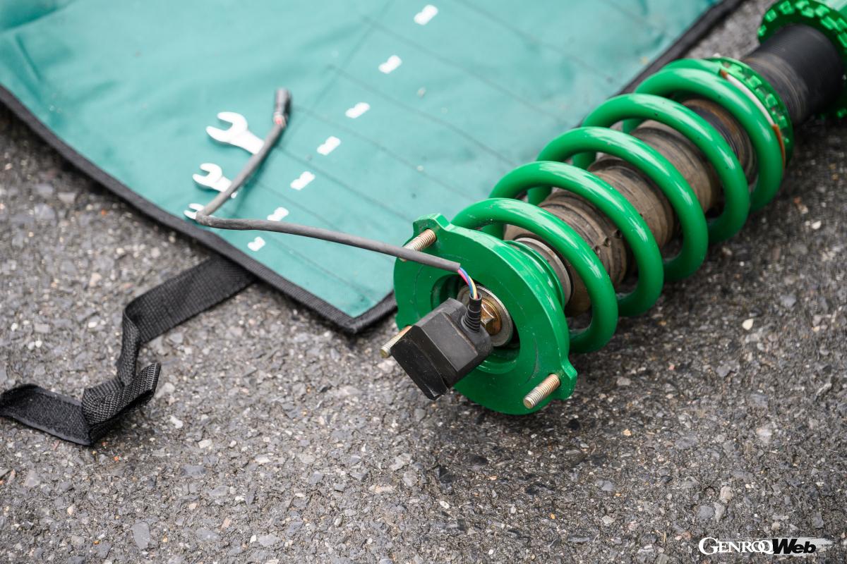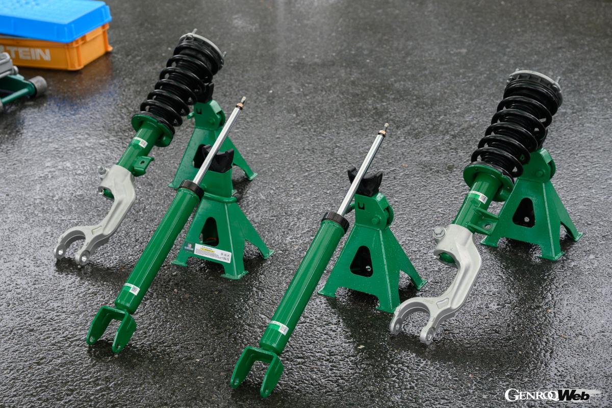 スタンダードの足回りで基本キャラクターを確認後、人気上昇中というテインの純正形状ダンパー「エンデュラ・プロ・プラス」に交換する。現場で交換してすぐ試乗できるというのも、モータースポーツ最前線での経験豊富なテインだからこそである。ちなみに「エンデュラ・プロ」シリーズの減衰力調整機構付きが「エンデュラ・プロ・プラス」で、スプリングはスタンダード品をそのまま使う。
