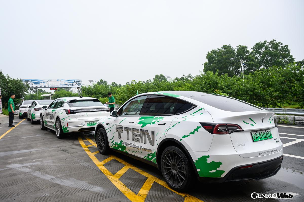 今や飛ぶ鳥を落とす勢いのBYDの「シール」は同社の“海洋シリーズ”(先日国内発売されたのは同シリーズのドルフィン)のトップモデルで、前後アクスルにモーターを積むAWDでシステム最高出力は390kW(530PS)ときわめて強力だ。ジーリー(吉利汽車)のEVブランドであるジーカー(Zeekr)の「001」は、シューティングブレークのようなボディに計400kW(544PS)を発揮する前後2基のモーターを搭載(AWD)、デザインもポルシェのタイカン・クロスツーリスモを彷彿とさせる。さらにテスラ・モデル3(スタンダードレンジRWD)とモデルY(ロングレンジAWD)という4台をまずスタンダードのまま試乗し、その後テインのサスペンション各種に交換して試した。