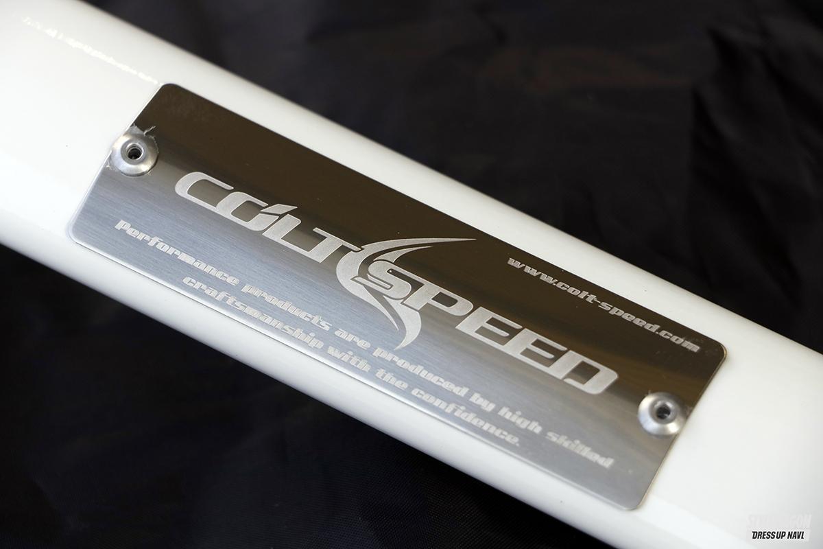 COXボディダンパーはヤマハ発動機が開発したYAMAHAパフォーマンスダンパーをコルトスピードがセッティングしたもの。車体下側フレームの前後2箇所に装着する。ストラットタワーバーはフロントサスの左右アッパーマウントをパイプで繋ぐバー。装着後はエンジンルームからほとんど見えない位置にセットされている。コルトスピード製は分割式でブレーキング時のバルクヘッドのたわみを防ぐマスターシリンダーストッパーも設けられている。作業自体は約2時間で終了した。