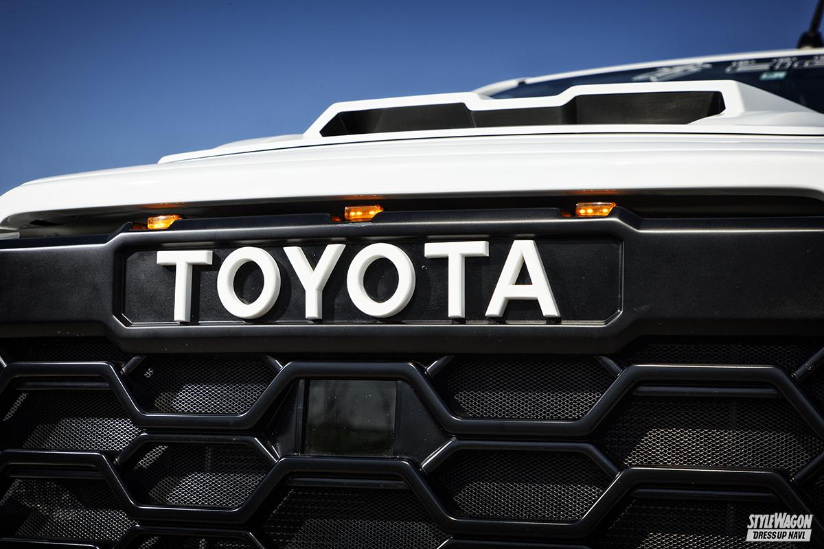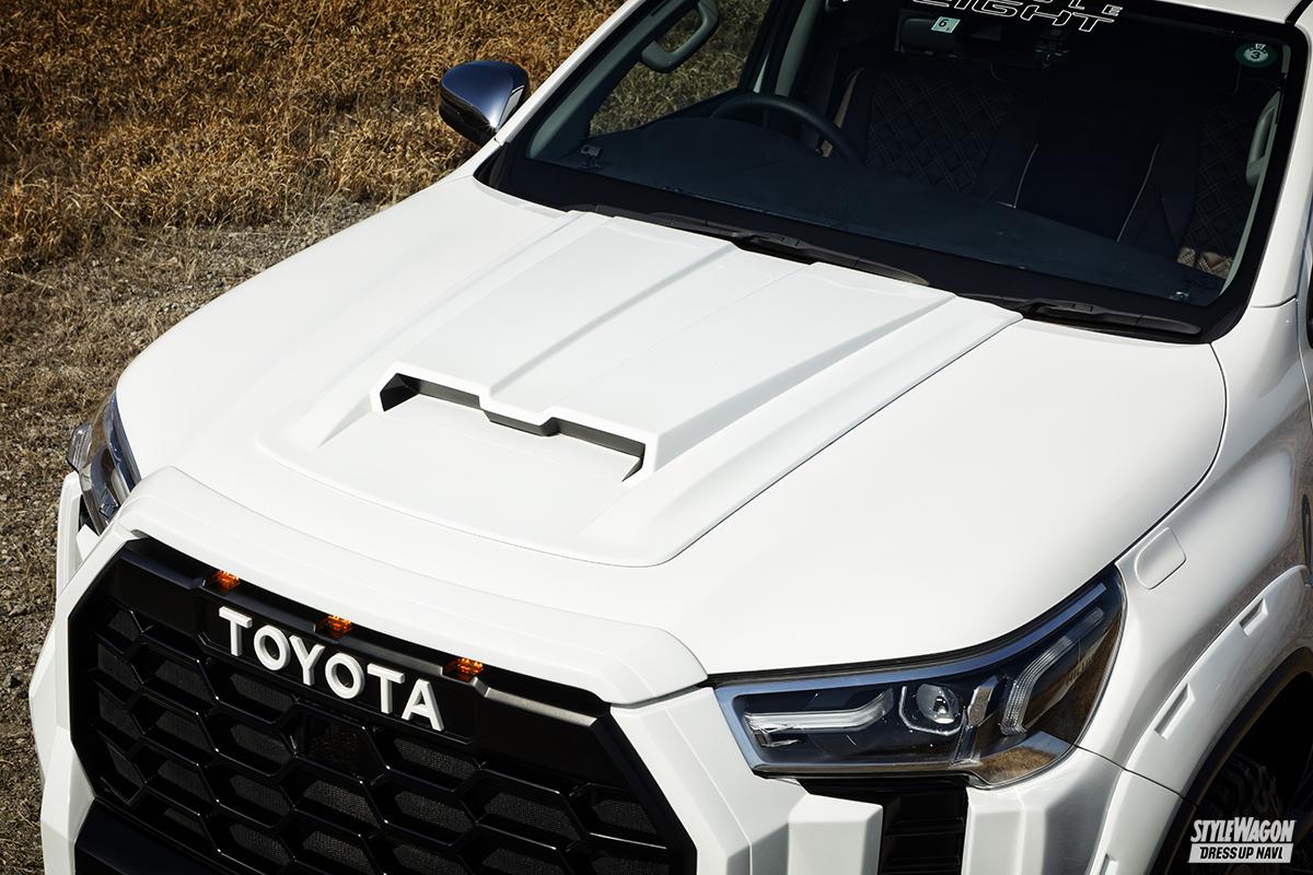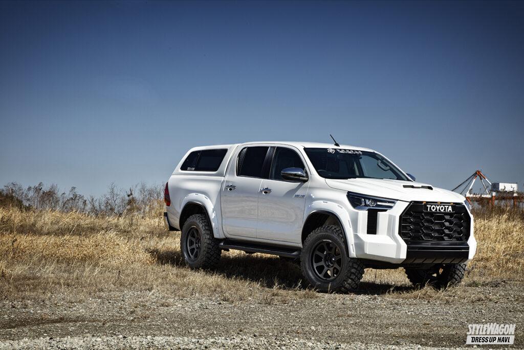 フェイスコンバージョン仕様と書いても「どこが?」という声が聞こえてきそうなほど、カンペキなバランスに仕上げられたこちらの車両。その正体はランクル300やレクサスLX用のエアロブランドとしても知られるダブルエイトのバンパースポイラーが装着された125系ハイラックス。デザインのモチーフとなったのは言うまでも無く、北米トヨタの人気ピックアップ、タンドラ。