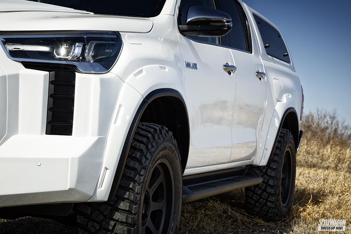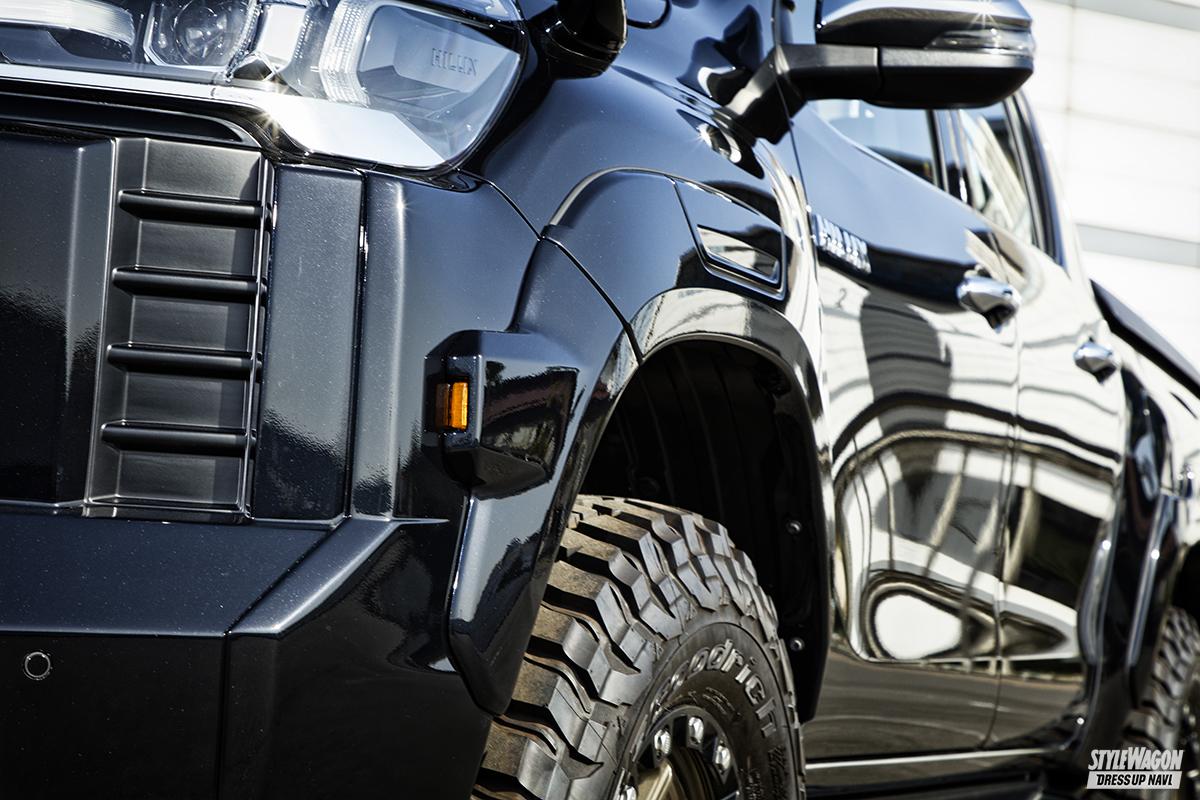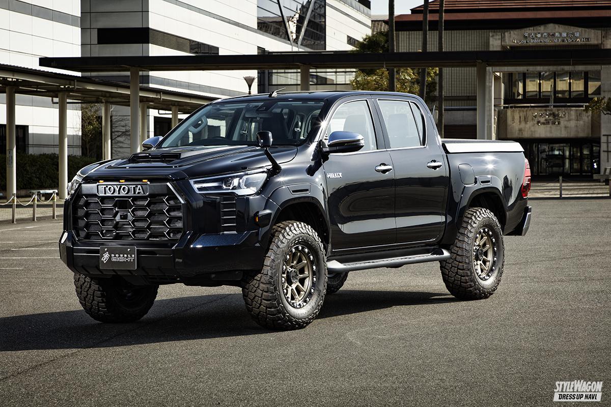 全幅2mオーバーという巨大なアメリカンサイズならではの堂々たる風格を、ハイラックスの枠組みの中にいかにして収めるか? そこには相当な苦労があったハズだが、何度見直しても力ワザでデフォルメしたような後付け感はゼロ。ルックス面のインパクトは言うまでも無いが、カメラやレーダーといった純正機能の移植についても可能な限り対応させるなど、実用面への配慮という点についても抜かりナシ。これまではリフトアップやガードバーの装着などが定番とされていたハイラックスのカスタムシーンだが、ダブルエイトのバンパースポイラーは新たな定番アイテムとして大いに人気を集めそうだ。