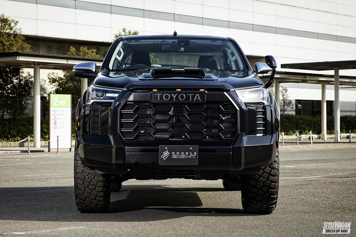 全幅2mオーバーという巨大なアメリカンサイズならではの堂々たる風格を、ハイラックスの枠組みの中にいかにして収めるか? そこには相当な苦労があったハズだが、何度見直しても力ワザでデフォルメしたような後付け感はゼロ。ルックス面のインパクトは言うまでも無いが、カメラやレーダーといった純正機能の移植についても可能な限り対応させるなど、実用面への配慮という点についても抜かりナシ。これまではリフトアップやガードバーの装着などが定番とされていたハイラックスのカスタムシーンだが、ダブルエイトのバンパースポイラーは新たな定番アイテムとして大いに人気を集めそうだ。