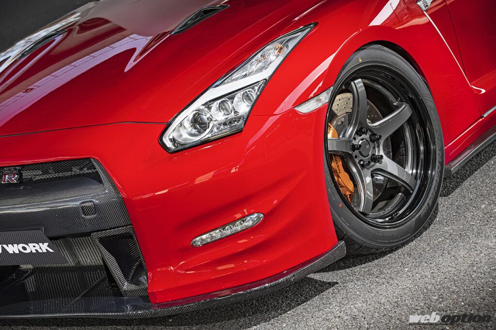 今回、撮影したグッドガンインターナショナルのR35GT-Rは同社代表の村本さんの愛車だ。足回りはエアリフターを4輪に装備したイデアルのID-ONE車高調と調整式のフロントアッパーアームを組み、約60mmのローダウンを実施。エアロはフェニックスパワーのカーボン製をフル装備している。