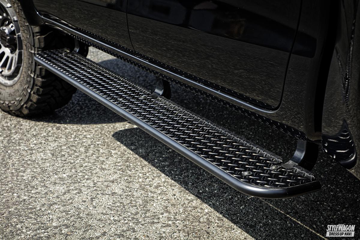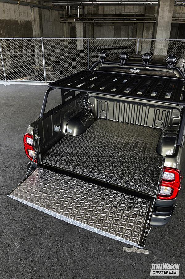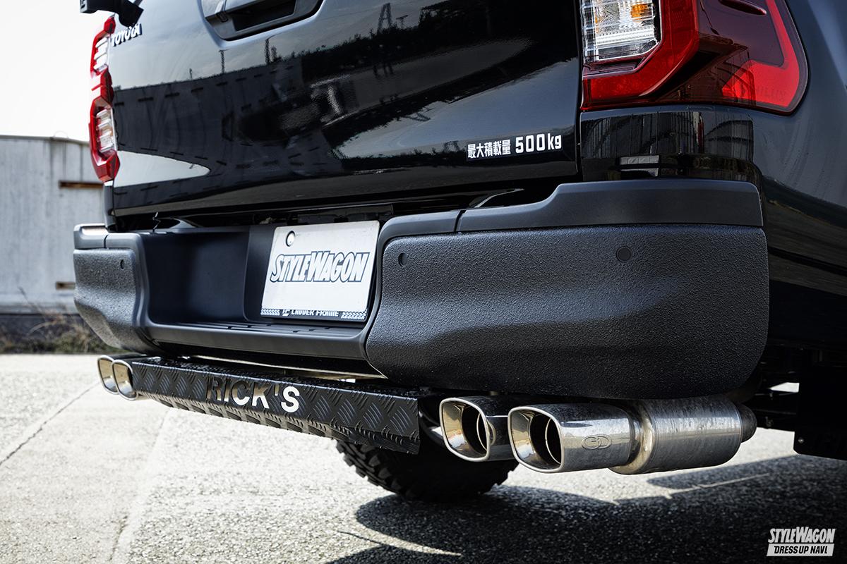 キモになるのは同社らしさが冴えわたるスキッドプレート&サイドステップ。縞板鋼板を使用しているのが特徴で、ハイラックスの道具感がより際立つのがポイント。今回、従来からラインアップしているフロント用に加えて、リアにも縞板仕様のスキッドプレートをラインアップ。サイドステップと合わせて縞板コーデが可能となっている。そのサイドステップは、2022年8月生産から純正の取り付け方法が変わったことを受けて、それに対応すべく新設計したものだ。