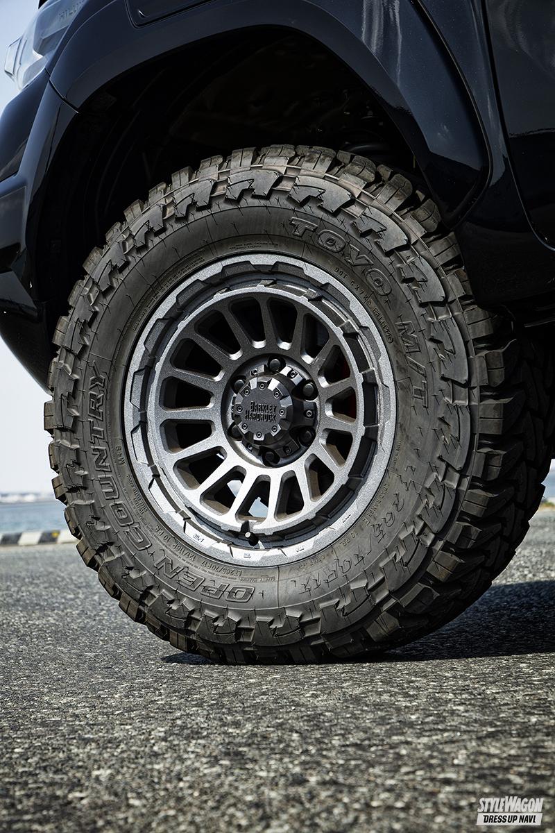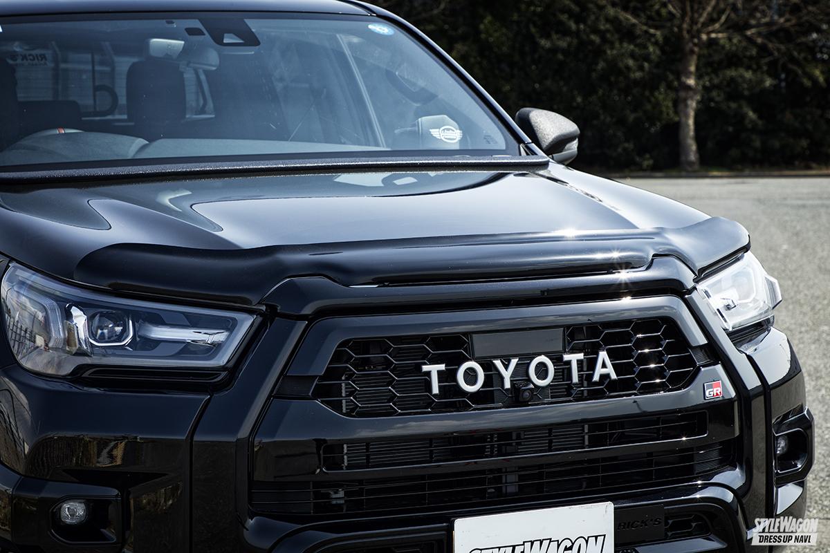 自動車メーカー純正パーツを手掛けてきた経験を活かし、FRP製品やメタル製品をプロデュースしている四駆カスタムの老舗、リミテッドチトセ。新たなデモカー、ハイラックスGRスポーツに対しては、ブラックコーディネイトによって精悍な印象に仕上げてきた。