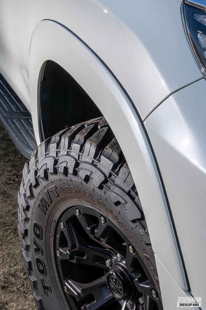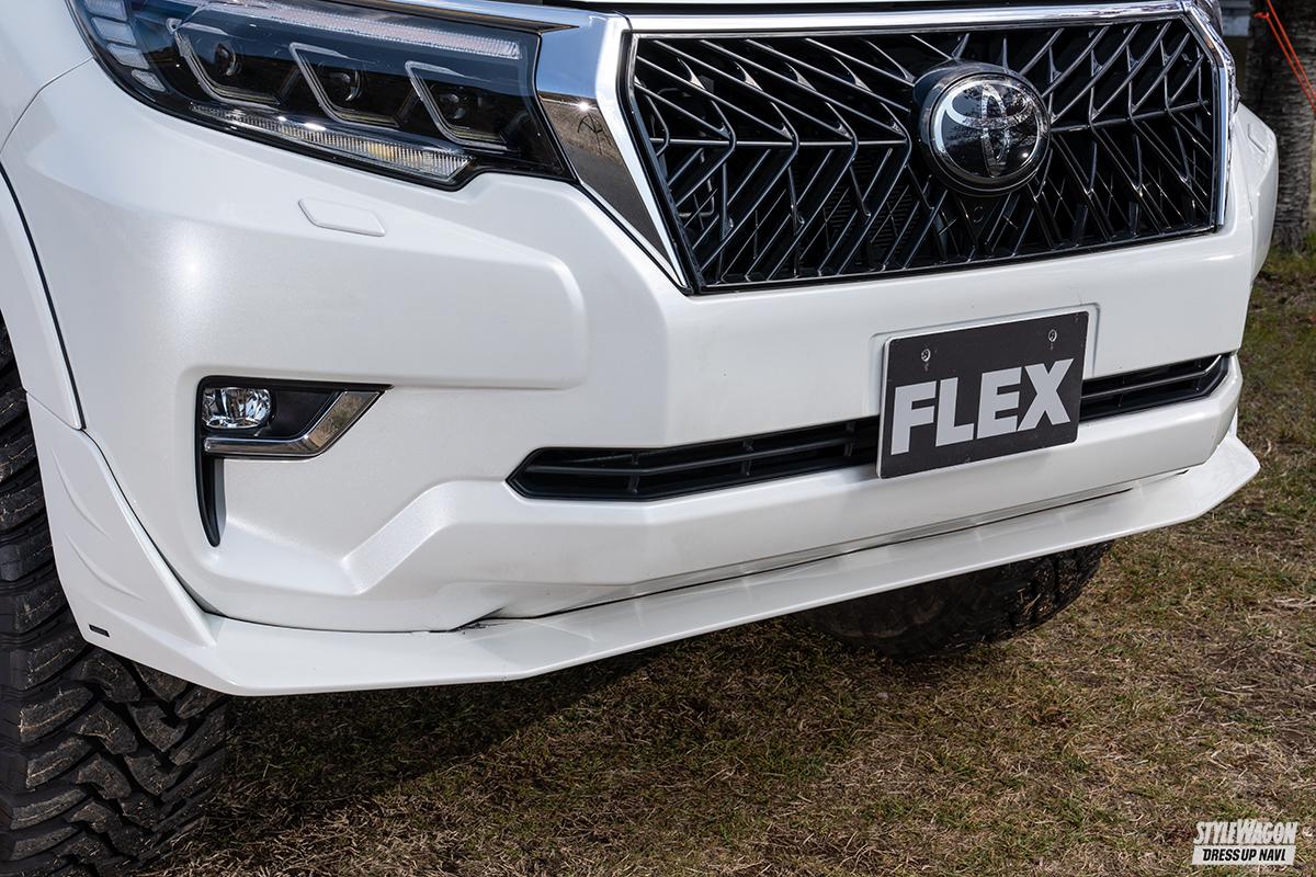 FLEX LAND CRUISER PRADOイジッたプラドを手に入れる際に、ここを見ずして検討するのは愚の骨頂! といっても過言でないほど、コンプリート販売にもチカラを入れているフレックス。全国に販売網を展開しており、新車ベースは当然、厳選した中古車両をベースに様々なコンプリート提案を行っている。まずは最寄りのショップをウェブサイトでご確認あれ。①フロントスポイラーモータースポーツ界の巨人「サード」と共同開発したエアロのなかでも、核となるがこのフロントスポイラー。両端にカナード風の立ち上げをもたせ、リップラインを鋭角に張り出させるなど、レーシングカーのフロントウイング的なアレンジが施されている。②リアアンダースポイラー純正バンパーの両端にちょい足しするプチスポイラー。サイズは小さいが、あるとないではボディバランスの観点からいっても違いは大きい。150全グレード対応。③リアスポイラー一般的にはリアウイングと呼ばれることが多いリアスポイラーは、ご覧のような翼端板付きのスポーティ仕様。純正被せ型で、エッジ感も強い。ハイマウントも活かせる。④オーバーフェンダーホイールの選択肢の幅を広げるだけでなく、見た目のマッシブさを強調するオバフェンは是が非でも欲しい。拡幅は片側9㎜と構造変更不要。前後ともに、疾走感を刺激するスリットがリア側に付くのがフレックス流。⑤スキッドプレートワイルド感を高めるロゴ入りスキッドプレートは、縞板とプレーンの2種類あり。悪路走行時のオイルパンをガードする機能派パーツでもある。⑥オリジナルマフラーオリジナルマフラーも積極的に開発。通常はバンパー後ろからの排気だが、デモカーはヒッチメンバーを装着しているため、バンパーの脇から出すサイド出しとしている。MGゴーレムワイルドさ満点のゴーレムは17インチをチョイス。ゴツさ満点のブロックタイヤ、オープンカントリーとの相性も抜群だ。デモカーが装着するルーフキャリアやサイドオーニングは、オーストラリアの名門「ライノラック」製。「パイオニアプラットフォーム」と呼ぶキャリアは使い方自由自在。そこにあるだけでも絵になる。一方「サンシーカー」と呼ぶサイドオーニングは、遠征先での日よけに最適。UVカット効果のある防水仕様だ。