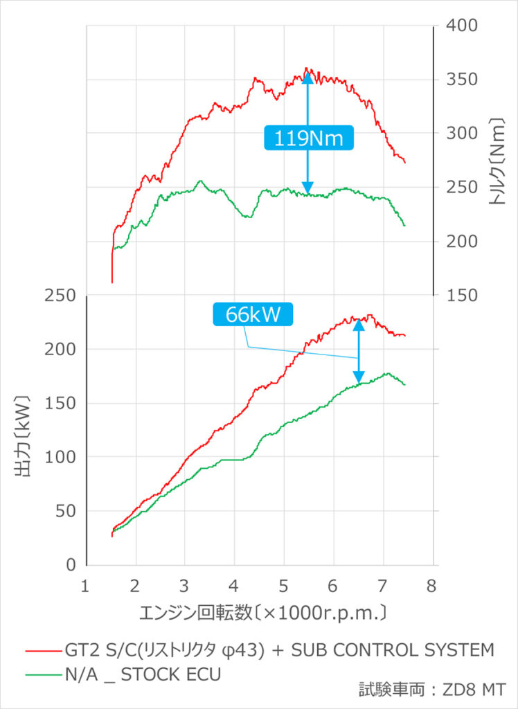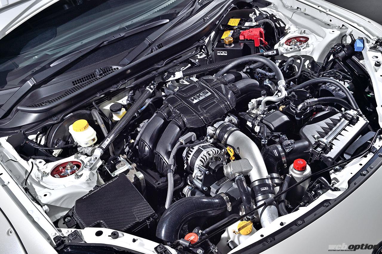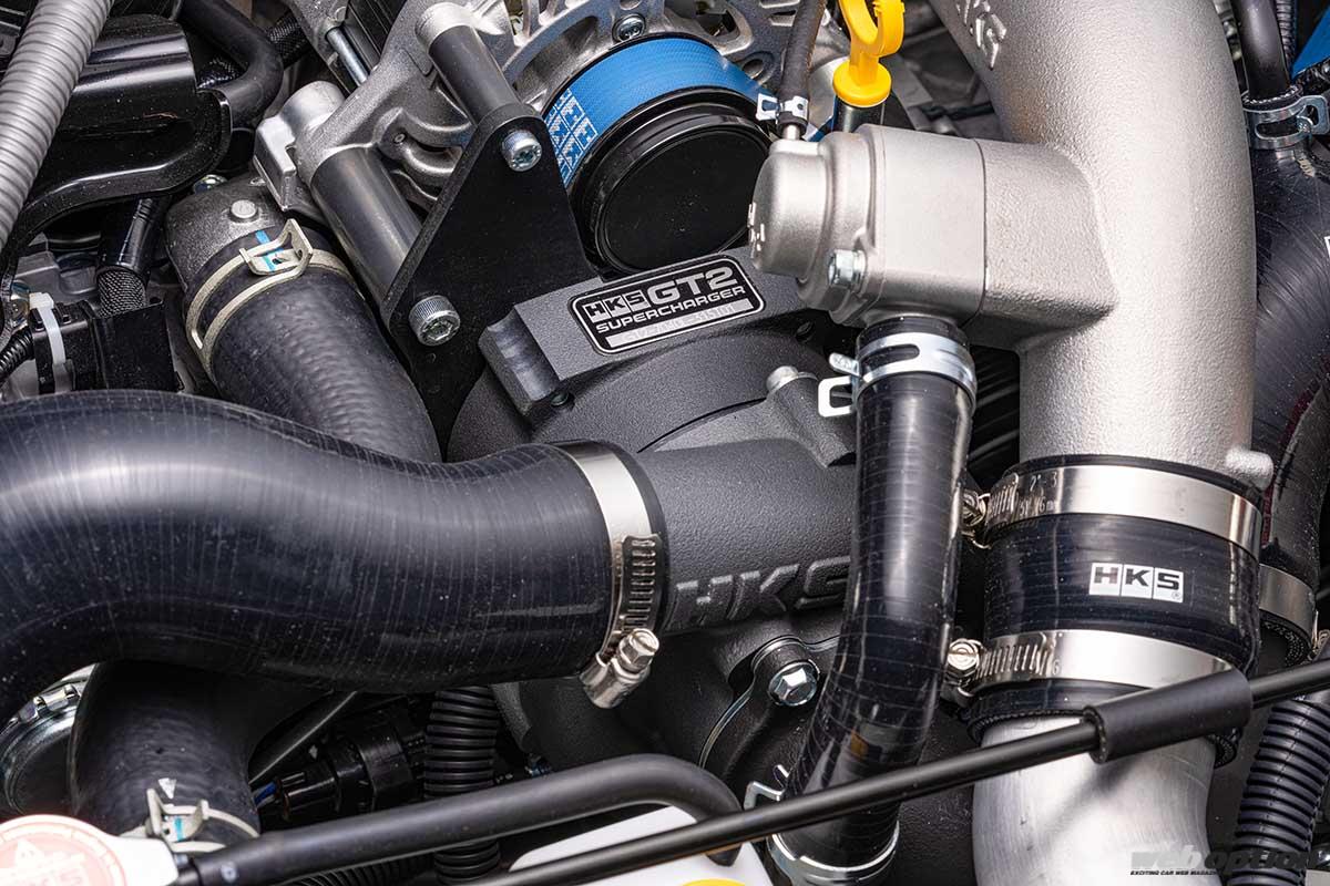 サブコン制御の効果は絶大だ。HKSの社内テストでは、GT2スーパーチャージャー仕様のZD8型BRZで316ps&36.8kgm(純正:241ps&26.1kgm)を記録。回転とともにブースト圧が高まっていくGTスーパーチャージャーは、NAライクなエンジン特性でターボ化した時のような違和感は皆無。さらに、吸気系で全てを完結できるため、車検も問題なくパスできるという点でも、時代に即したパワーチューニングと言える。