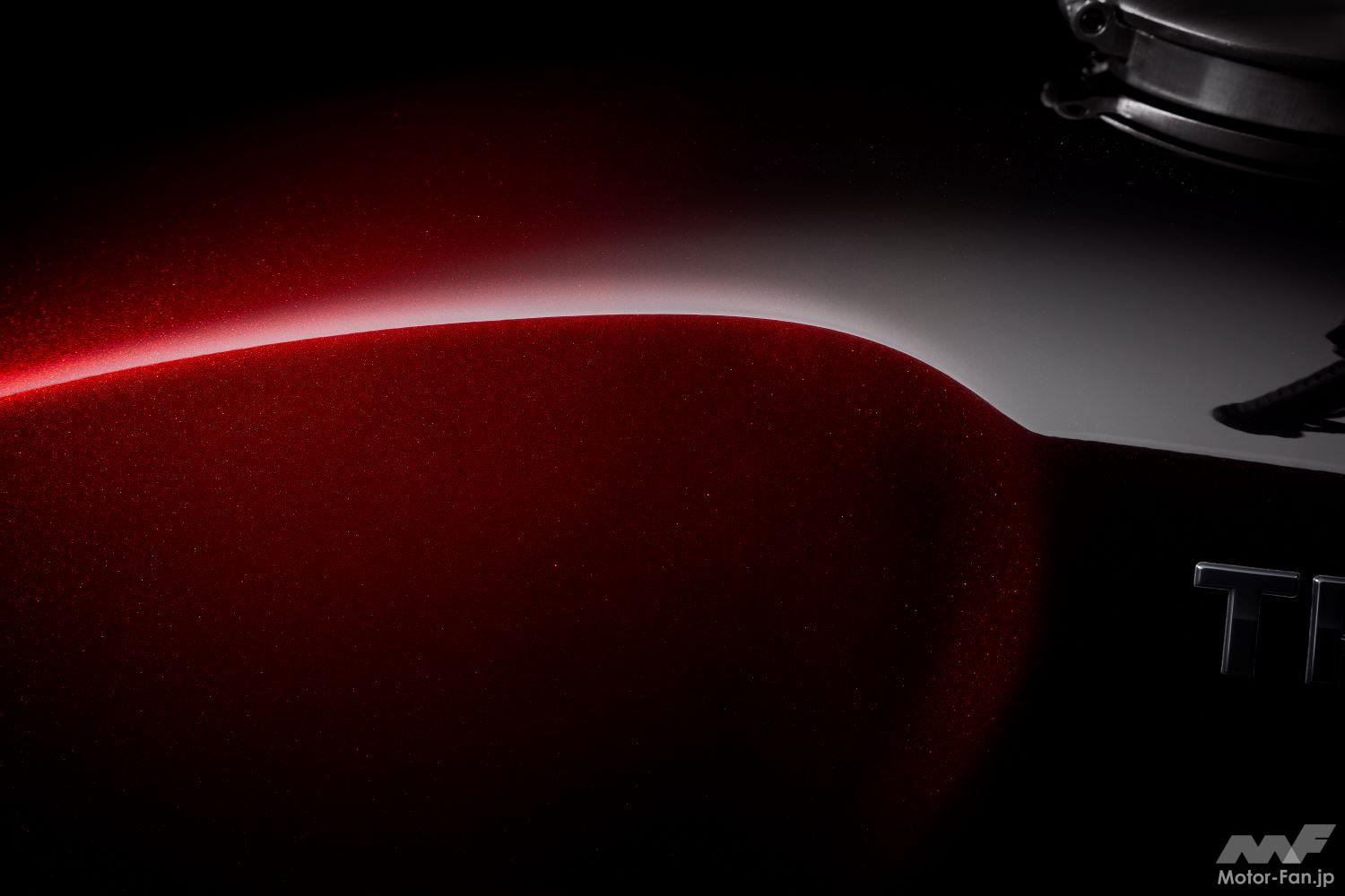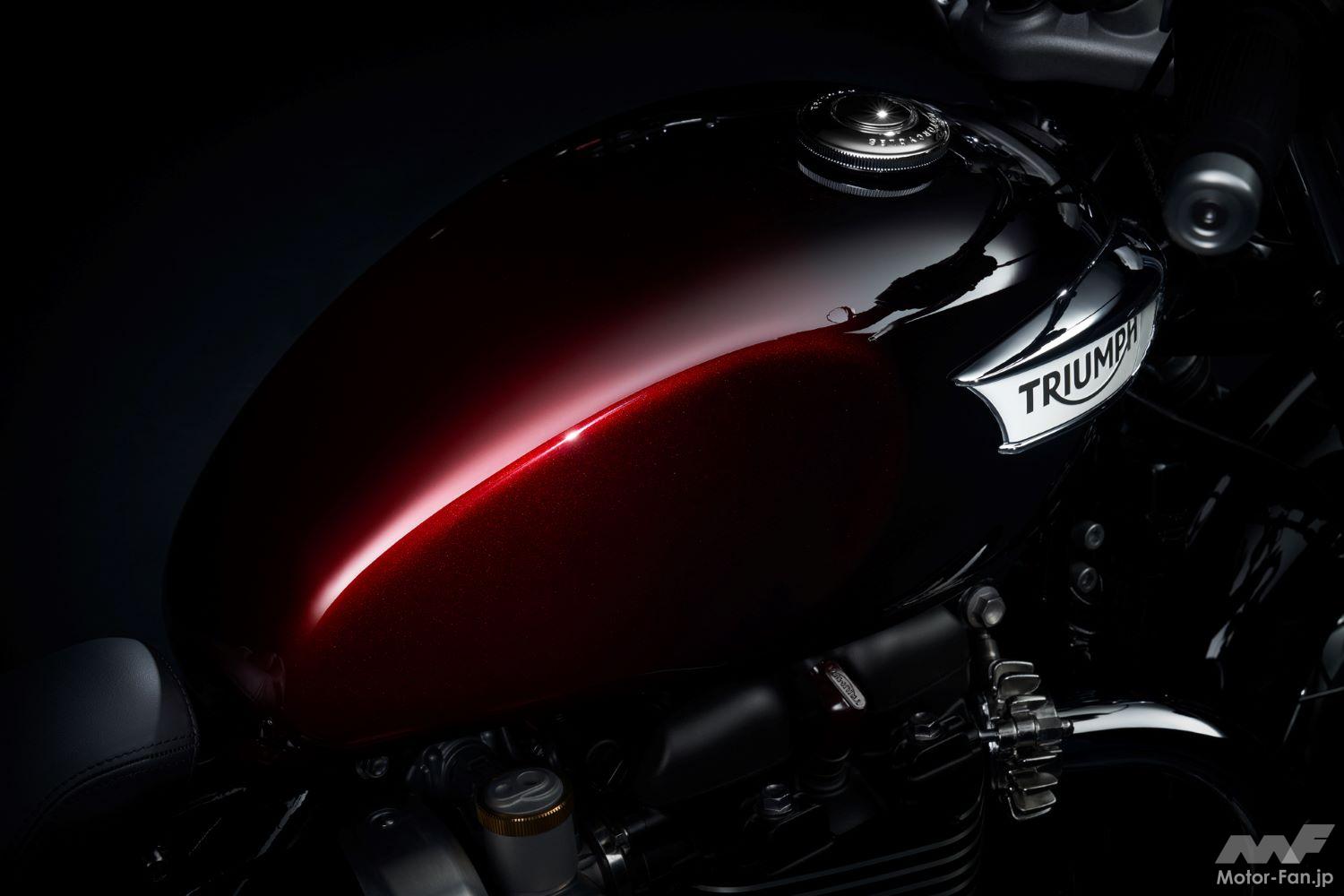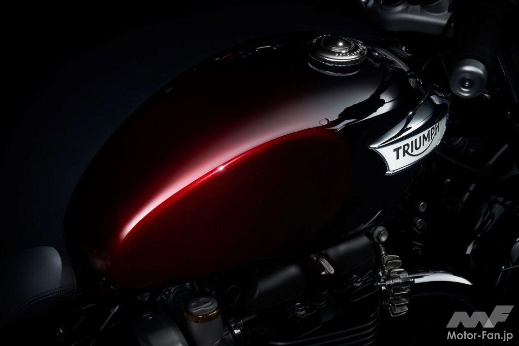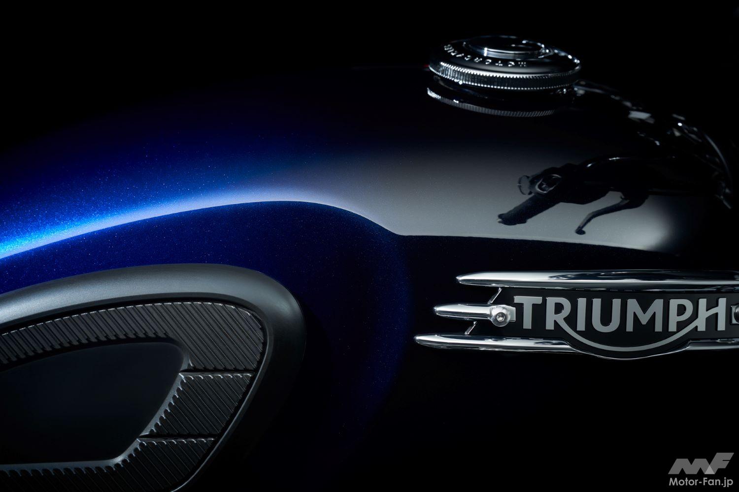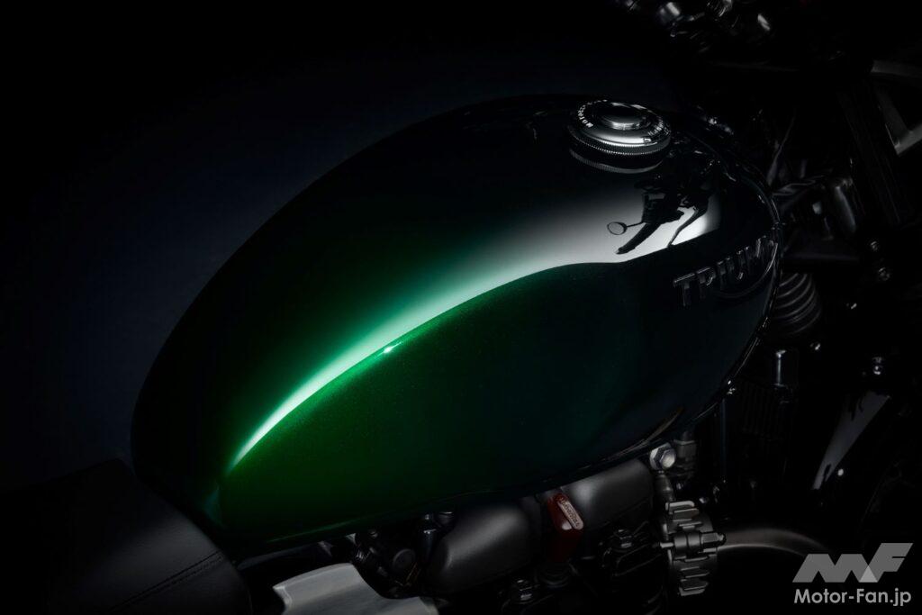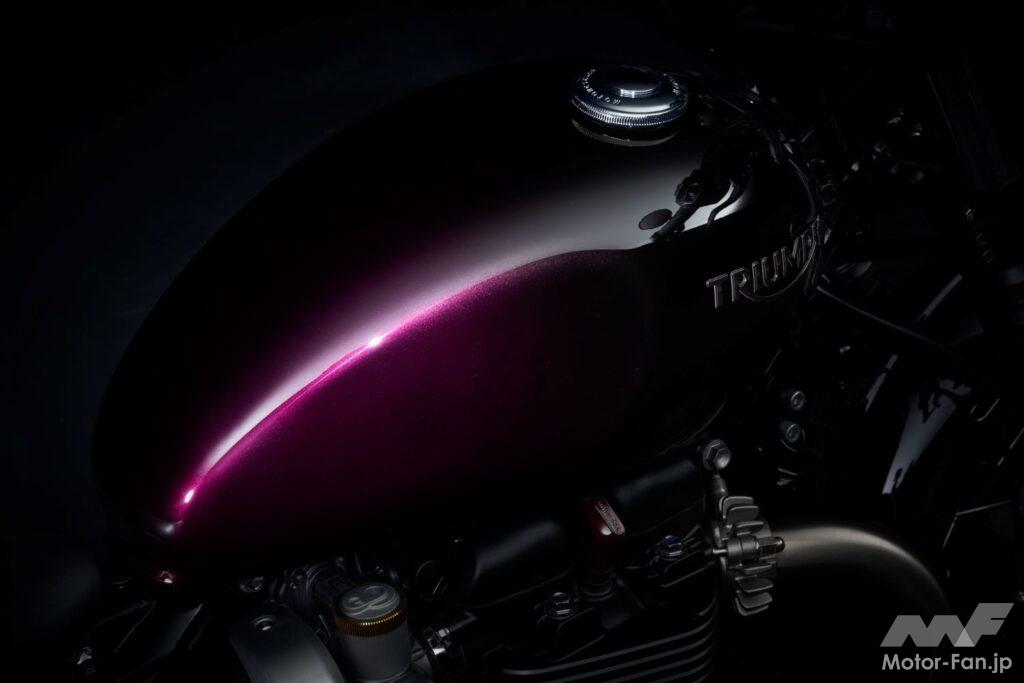暗いグラファイトから、発色の良い明るいカラーまで、光に当たるとさまざまな色合いとなり、どの角度から見ても色味が異なって見える。塗装はトライアンフのペイントチームによるハンドペイントなので、それぞれのバイクは同じものが無い唯一無二の特別なカラーとなる。