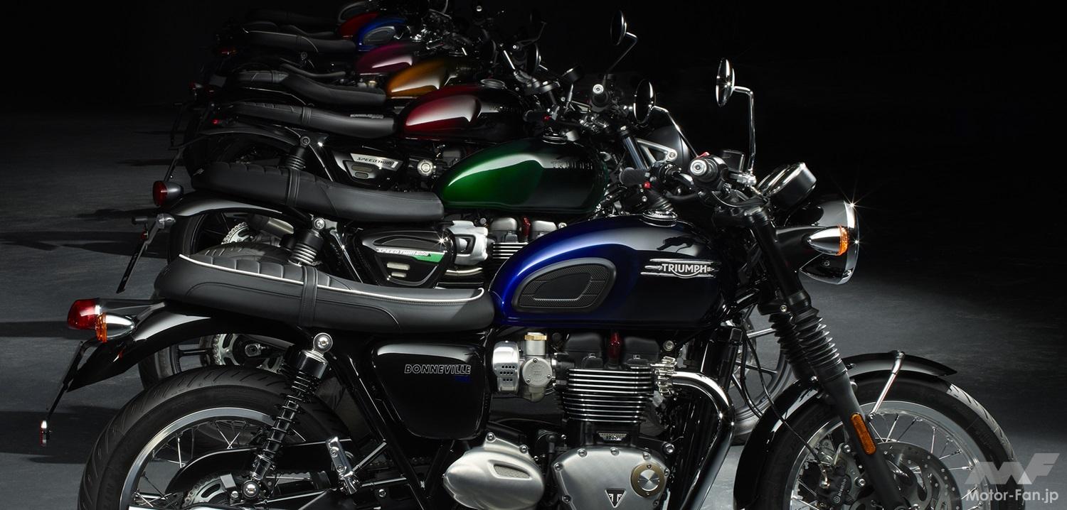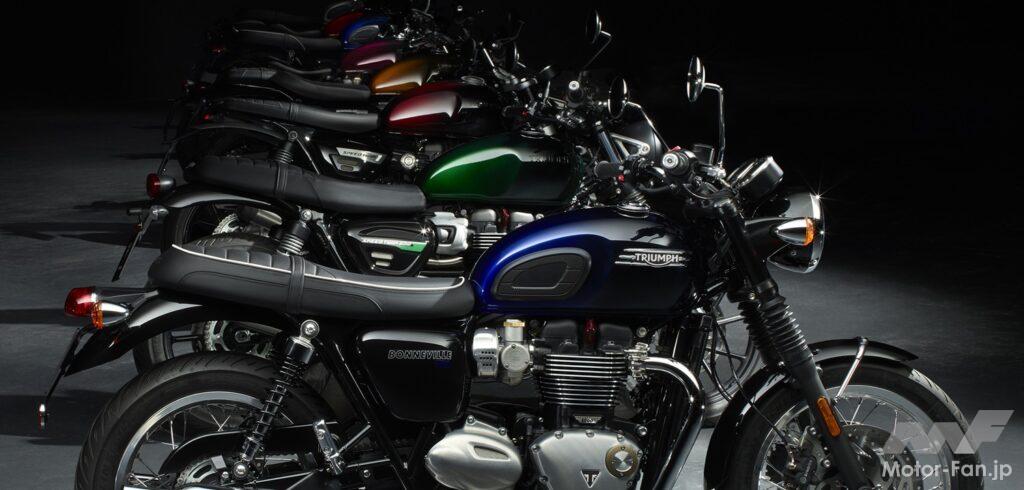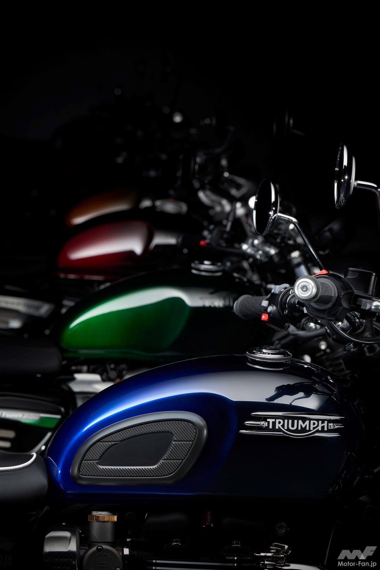 「Bonneville Speedmaster」、パープルの「Bobber」、ブルーの「T100」と「T120」、グリーンの