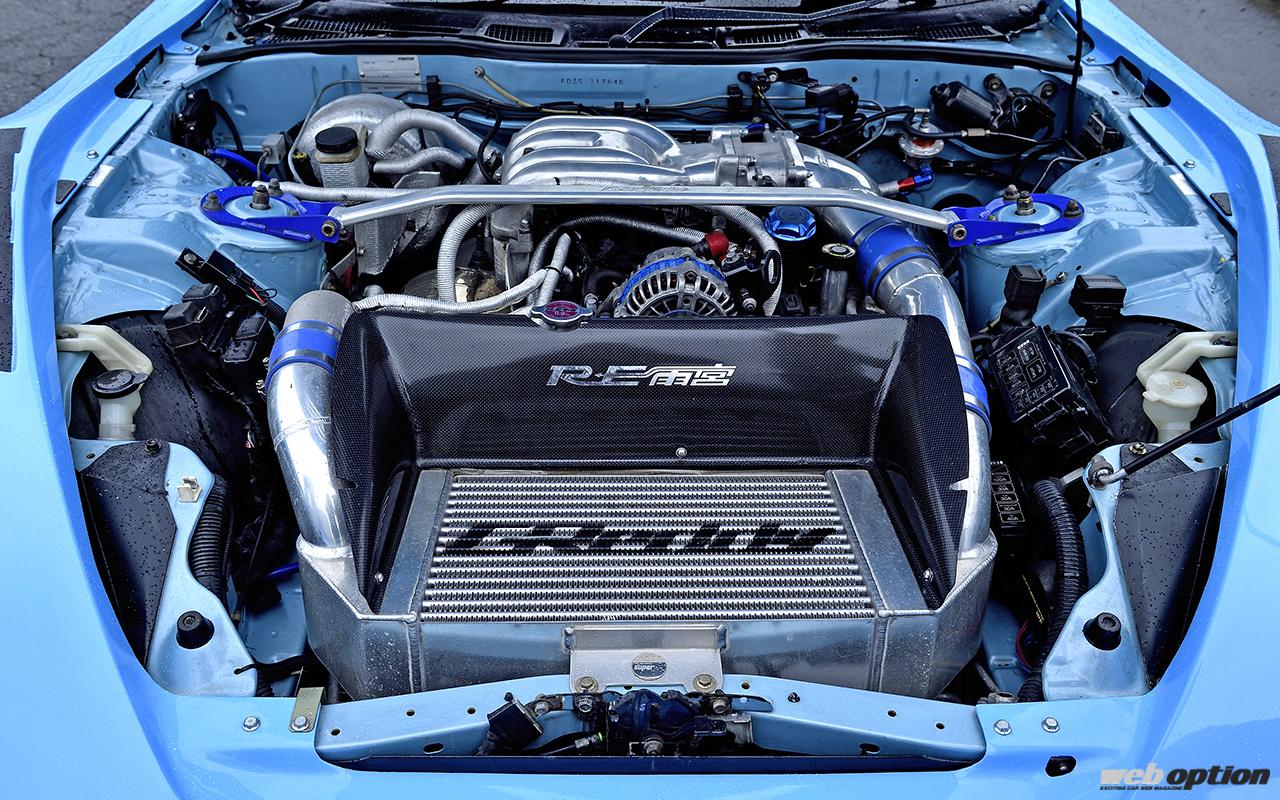 エンジンは、サイドポート拡大加工が施された13B-REWにTD07-25Gタービンをセットした420ps仕様。3層のインタークーラーとラジエターはVマウント化され、冷却効率にも余裕があるメイキングとなっている。