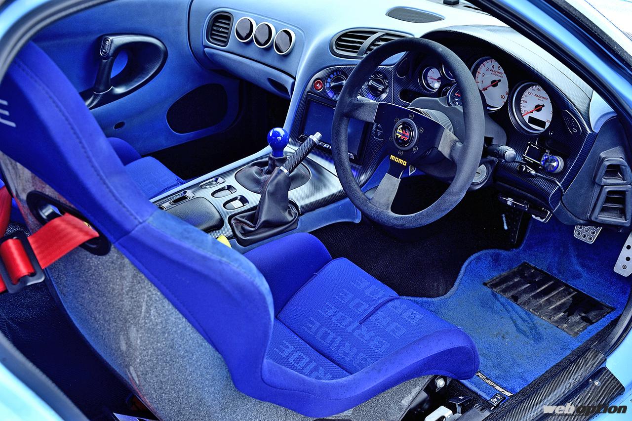 「手に入れた時は濃いブルーにオールペンされていて、2009年に見た水色の幻気ではありませんでした。事故で失った1台目のFD3Sも水色にオールペンしていたこともあって、まずはあの時と同じイメージの水色に戻しつつ、アクセントにレッドパールを少し入れてオールペンしました」。