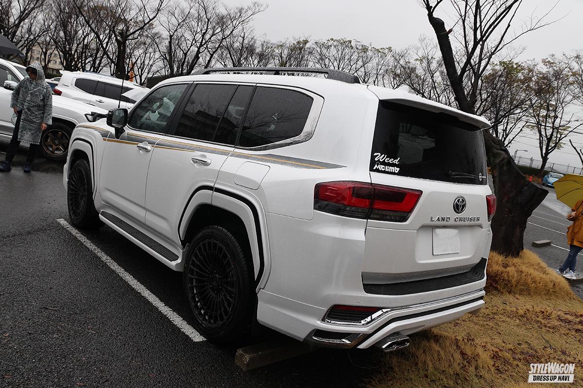 ランクル仲間の動画を見て気に入り、取り寄せてもらったサイドのストライプがカッコいい! 足元を見てみると、最新の鍛造ホイール、ノマド フォージド22インチが。エムクライムが開発していると聞いて、「一番に入れたい!」と思ったのだ(イベント数日前に無事装着された)。リアエンブレムはGR純正に置き換えるなど、ディテールにもこだわっている。そして後席にはカマタマーレ讃岐のマスコット、さぬぴーが着席。オーナーはスポンサー企業に関わっていて、ここでも広報活動をしていたのだ!!