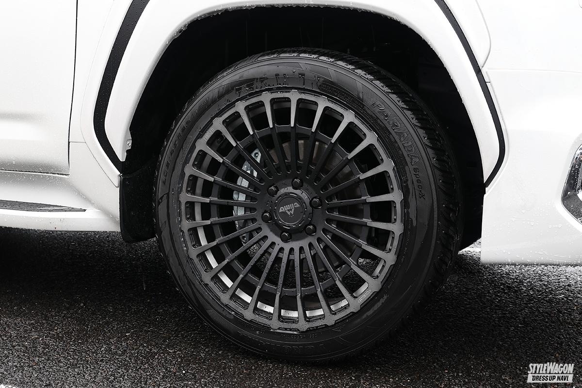 WHEEL●エムクラム・ノマドフォージド(22×10J+56) TIRE●ヨコハマ・パラダ スペックX(285/45) EXTERIOR●F/S/R/フェンダー=モデリスタ、グリル=GR用ブラックアウト、海外用サイドステッカー、GR用エンブレム、ドアミラーカバーブラックアウト AUDIO●JBLサウンドシステム、セキュリティ=MITガレージ