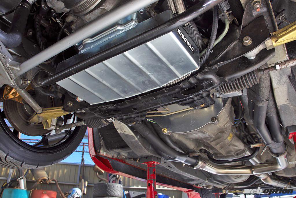 なお、アメリカで販売されているLS1換装キットは左ハンドル用のため、右ハンドル仕様で使う際はステアリングラックの取り付けなどの加工が必要とのこと。オイルパンも、フロントのサスメンバーとスタビを逃げるように加工済みだ。