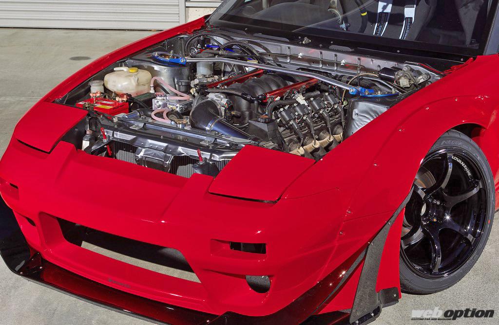 「ものすごく程度の良い180SXが手に入ったので、キッチリと仕上げたドリ車を作りたくて。外装はロケットバニーで決めていたんですが、この迫力に見合ったエンジンの仕様がなかなか思いつかず…。どうしようか悩んでいる時に、とあるミーティングでV8を積んだクルマを発見したんです。エキゾーストサウンドを聞いた瞬間に『これだっ!!』と思いましたね」とはオーナー。