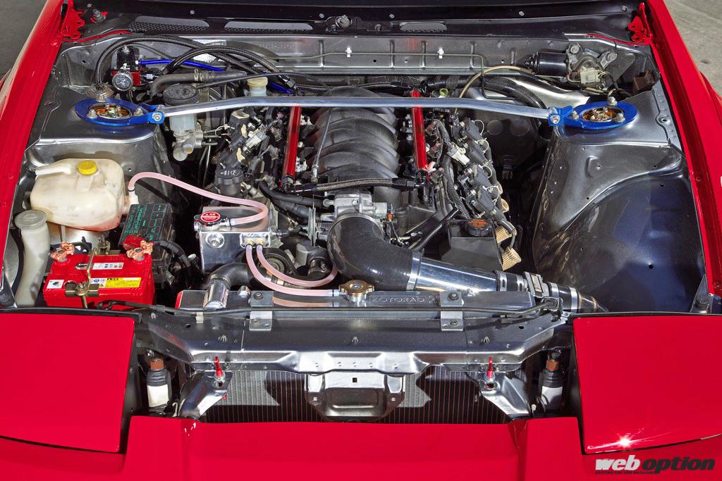 換装にあたっては、アメリカで販売されているS13系のLS1スワップキットを使用。さらに、元々6000rpmがレブリミットのLS1を7000rpmまで回せるように動弁系を強化しつつハイカムも導入。アイドリング付近から約50kgmのトルクを発生する400psのメカチューンユニットに仕上がっている。