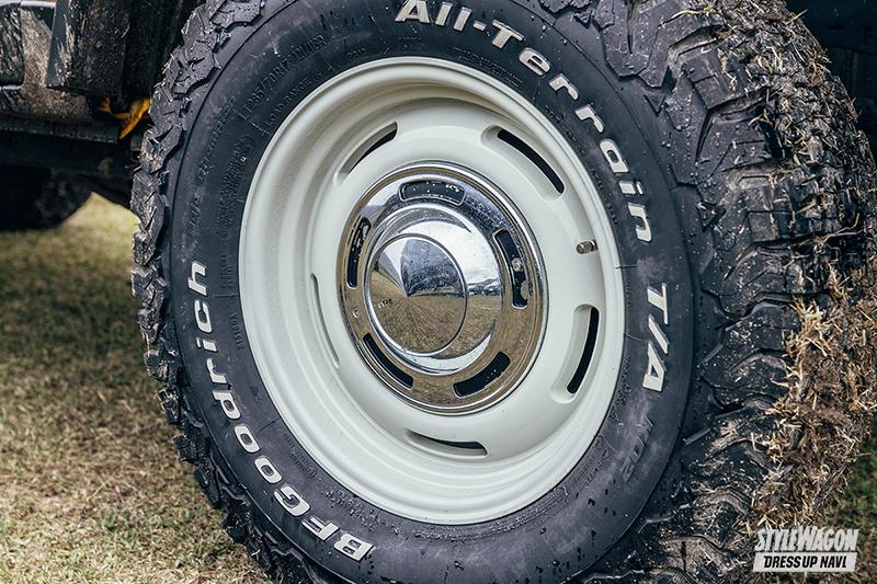 ●ホイール:ディーン・クロスカントリー(17×7.0J) ●タイヤ:BFグッドリッチ(285/70) ●エクステリア:フロントグリル=ワンオフ塗装、サイドオーニング=ARB ●足まわり:リフトアップ=F2.5インチ&R3インチ