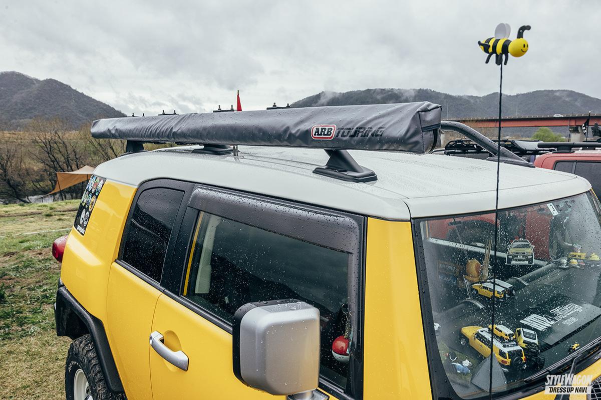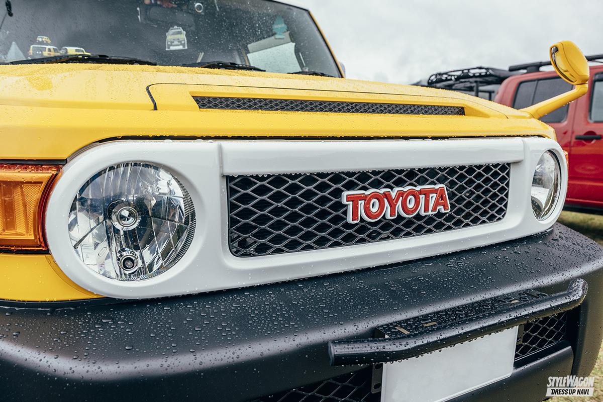 3年ほど前、富士周辺で行われたキャンプイベントに出掛けた際に、FJクルーザーの魅力にどハマりしたという、ゆきんこさん。クルマだけでなく現場の空気感のあまりの心地良さに、「来年は私も絶対にFJを買って、このイベントに参加します!」と、仲間たちに宣言。翌年、見事に有言実行を果したという。カスタマイズ云々よりもこのクルマのすべてが大好きということで、変更点はフロント2.5インチ、リア3インチのリフトアップの他はホイールを17インチのディーンという感じでフィニッシュ。その他、さりげないアピールポイントは自家塗装のフロントグリルとバンパー下のプロペラ(笑)。これだけオーナーに愛されてるクルマって、幸せだ〜。