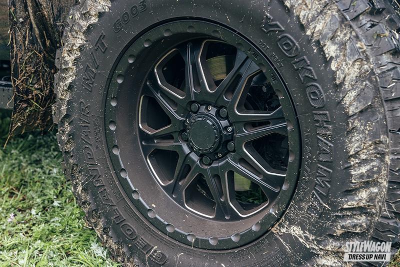 ●ホイール:MKW・MK-66(16×8.0J) ●タイヤ:ヨコハマ・ジオランダーMT(265/75) ●エクステリア:フロントガードバー&フェンダー&グリル&アンダーガード=マドリス、サイド=自作、リア=ハイワークス、フォグカバー=カディス ●足まわり:ダンパー=ビルシュタイン、ハートランドキット+TGSスプリング ●マフラー:エルフォード