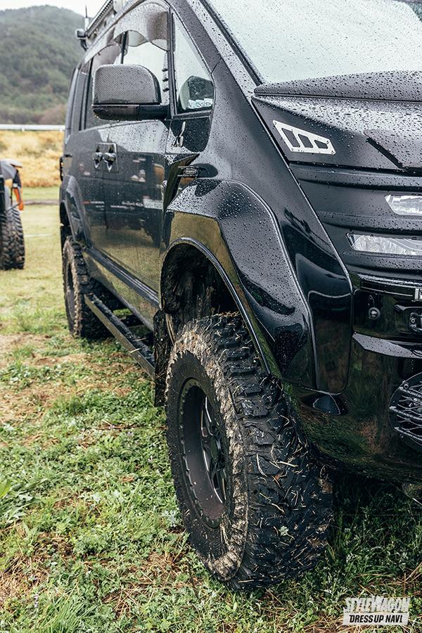 姫路からエントリーしてくれたガンダムD:5さん。5年前に購入したD:5は、人気ブランドのパーツを絶妙なバランスでコーディネイト。その内容はフロントのグリルガードやアンダーガード、オーバーフェンダーなどがマドリス。フォグランプやテールのガード類などディテール面にはカディスを使用。さらにルーフラックは4×4マチヤマによるこだわりのワンオフオーダー品を装着。タイヤ/ホイールは265サイズのヨコハマジオランダーと、ブラックのMKW・MK-66という組み合わせ。最大の見せ場である車高はハートランドの6インチアップキット+TGSのスプリングでトータル7インチリフトアップ。エルフォードの4本出しマフラーも自慢のアイテムだ。
