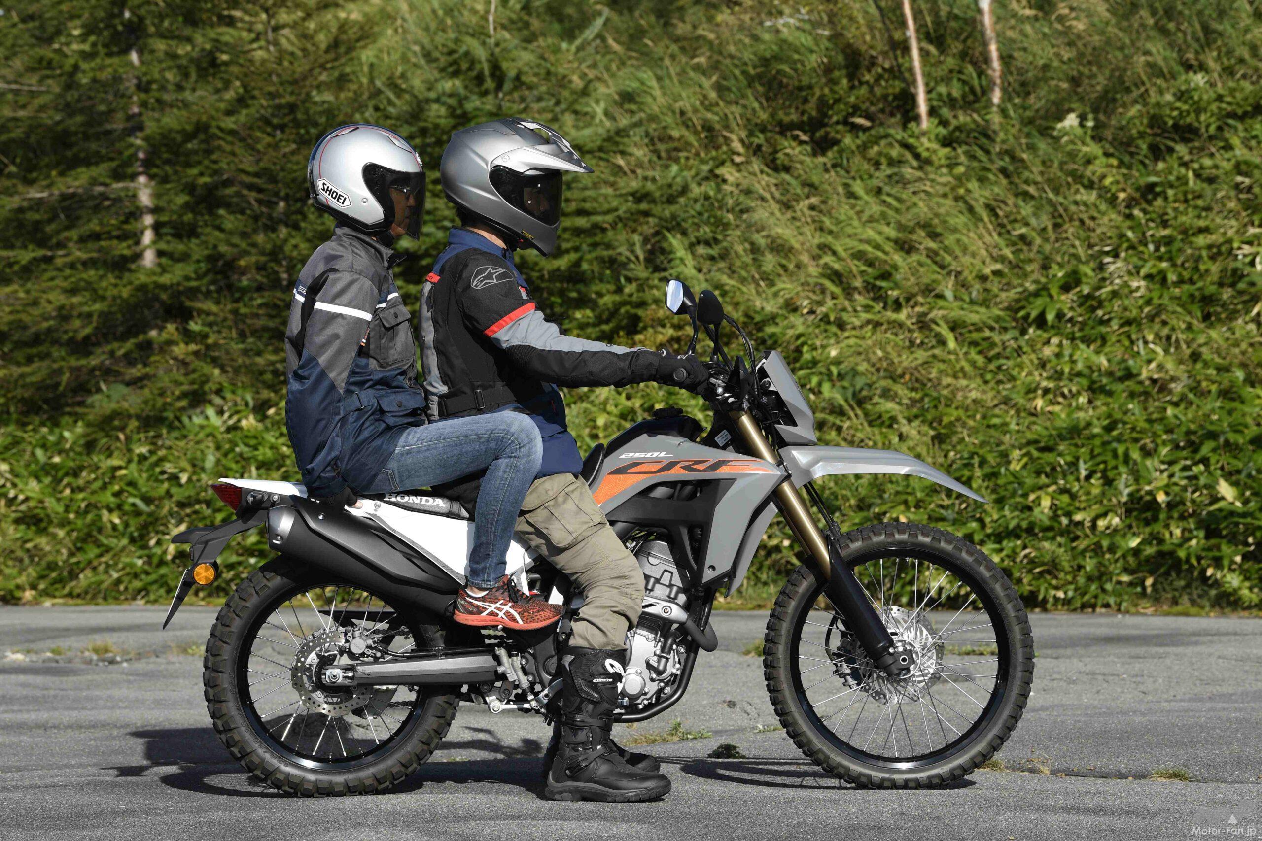 サイドスタンドを払って車体を直立させる際は、軽二輪のトレール車にしてはちょっと重いかな……と感じた。でも現在の250ccクラス全体の基準で考えると、141kgの車重は軽い部類で、左右45度のハンドル切れ角は相当に大きいので、取り回しは至ってイージー。なお同系の水冷単気筒を搭載するホンダ車の重量とハンドル切れ角は、CB250R:144kg・40度、CL250:172kg・38度。