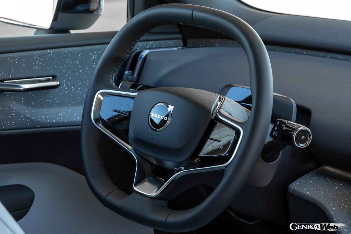 とはいえ全長4235mm、全幅1835mm、全高1550mmのボディは、日本の道路や機械式駐車場にギリギリ収まる堂々たるサイズである。エクステリアは、EVならではのフロントシールドデザインやボルボのアイデンティティを主張するトールハンマーライトが印象的だ。外装と内装はアルミニウム約25%、スチール約17%など高いリサイクル率を誇り、意識高い系への訴求も抜かりない。