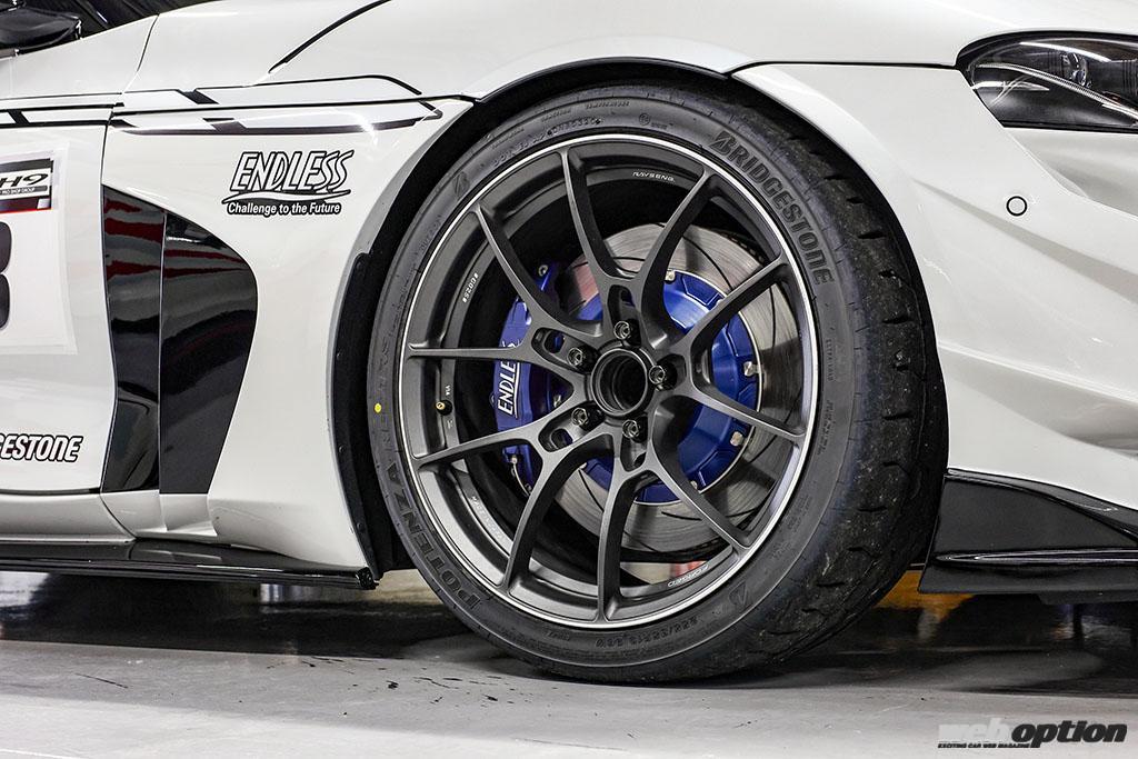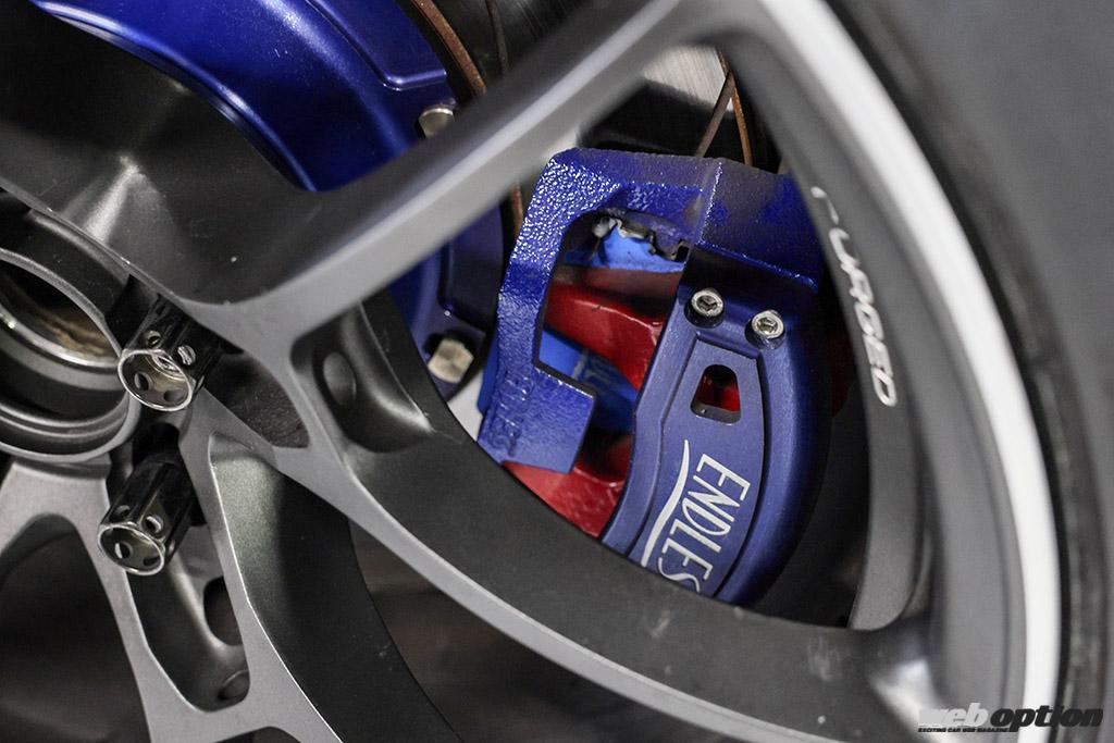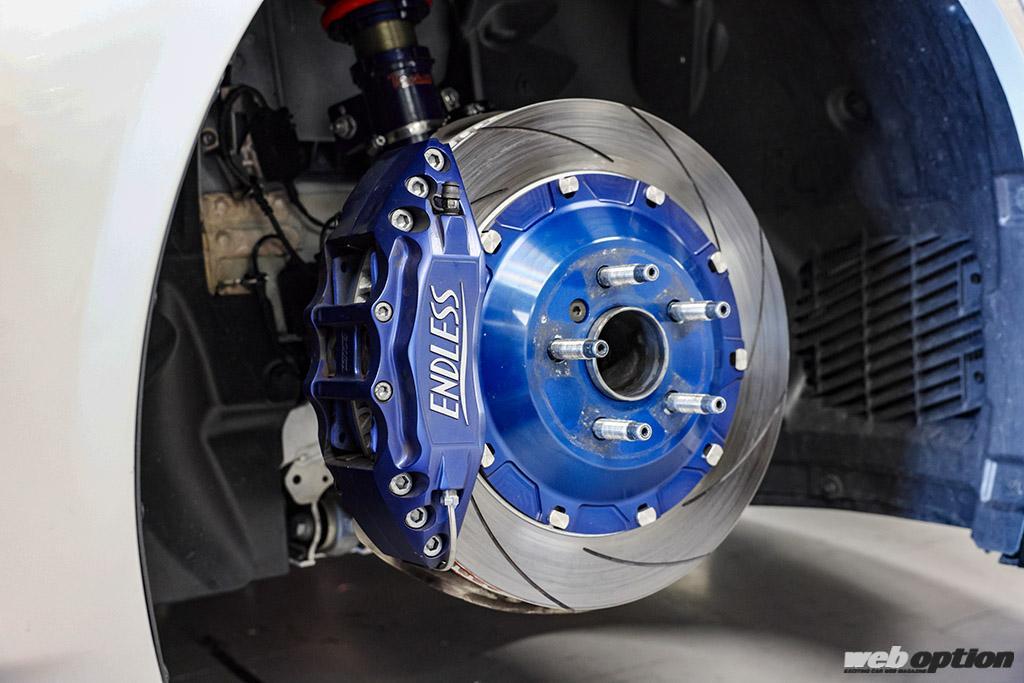 ホイールはボルクレーシングG025の19インチ(FR共に10J+33)、タイヤはポテンザRE-12DタイプAでサイズは285/35だ。ブレーキはエンドレス製でフロントが6ポットキャリパー+370mmローター、リヤは電動キャリパー対応のインチアップキットを使い355mmローターを備える。