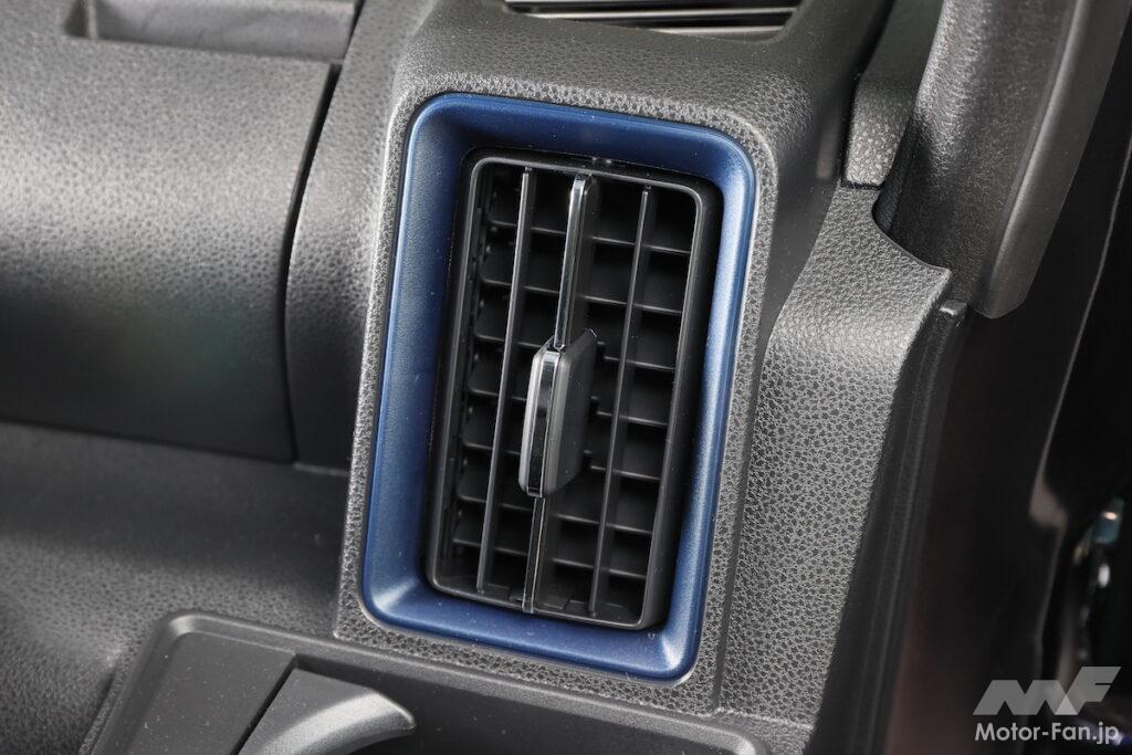 ダッシュボードやインストゥルメントパネルなど、コックピットまわりのレイアウトはタントシリーズで共通。カスタムはエアコン吹き出し口やダッシュボードに加えられたブルーの差し色がアクセントになっている。さらに、センターコンソールまわりのパネルをグロスブラック、ステアリングやドアハンドルにメッキとして上質感を演出する。