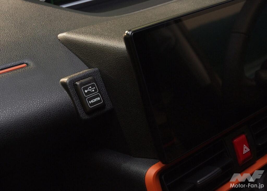 助手席ダッシュボードにはHDMIポートとUSBポートを設置。USBポートはタイプAで出力は2.1A。スマートフォンをはじめとしたデジタル機器の給電だけでなく、データ通信も可能な仕様となっている。好きな画像をUSBメモリを使って本体に取り込めばオリジナルのオープニング画像として設定できる機能もある。
