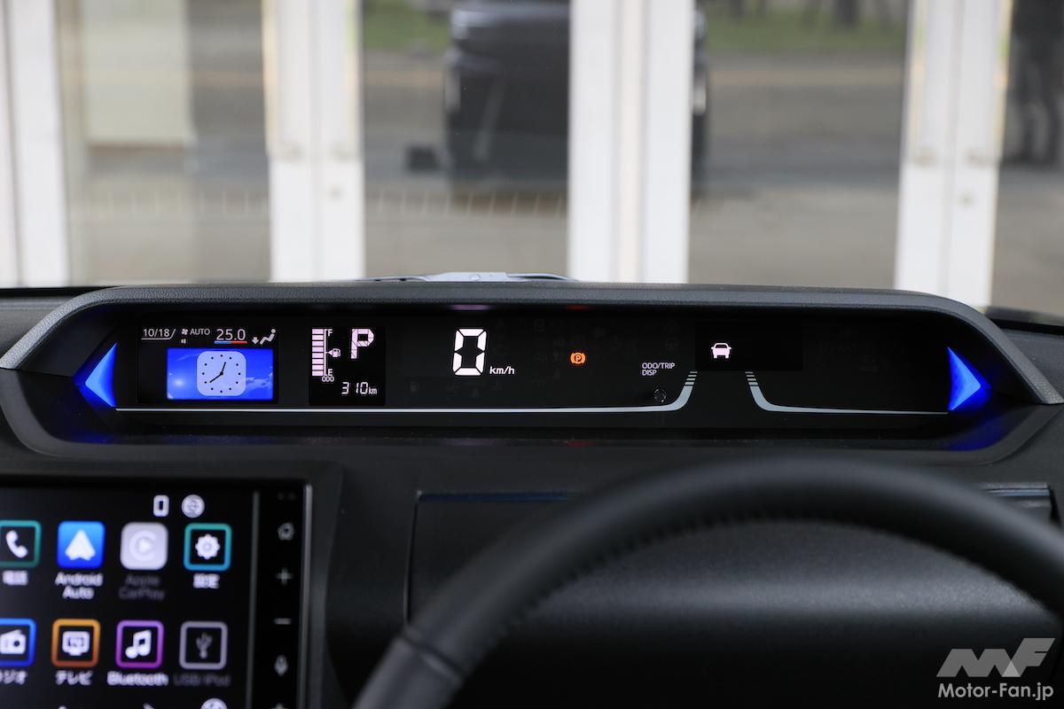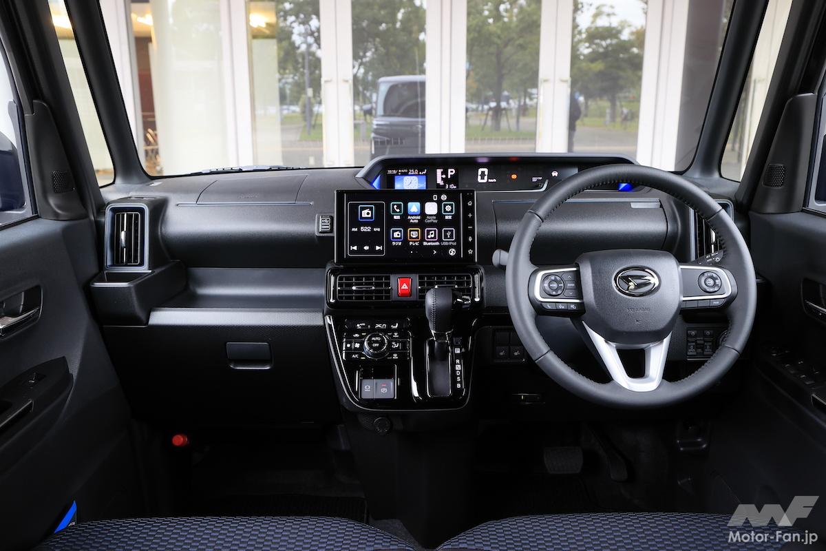 ダッシュボードやインストゥルメントパネルなど、コックピットまわりのレイアウトはタントシリーズで共通。カスタムはエアコン吹き出し口やダッシュボードに加えられたブルーの差し色がアクセントになっている。さらに、センターコンソールまわりのパネルをグロスブラック、ステアリングやドアハンドルにメッキとして上質感を演出する。
