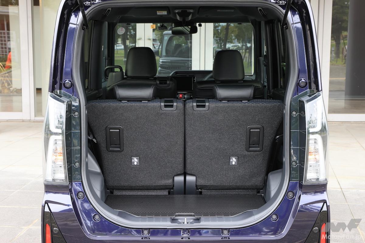 さらに、ファンクロスも含めタントシリーズ全車に標準装備となった上下2段調節式デッキボードにより、リヤシート格納時のフルフラット化を実現したほか、ラゲージアンダートレイと2階建てで収納スペースを活用できるようになっている。また、上下2段調節式デッキボードは取り外して単体で使用することも可能だ。