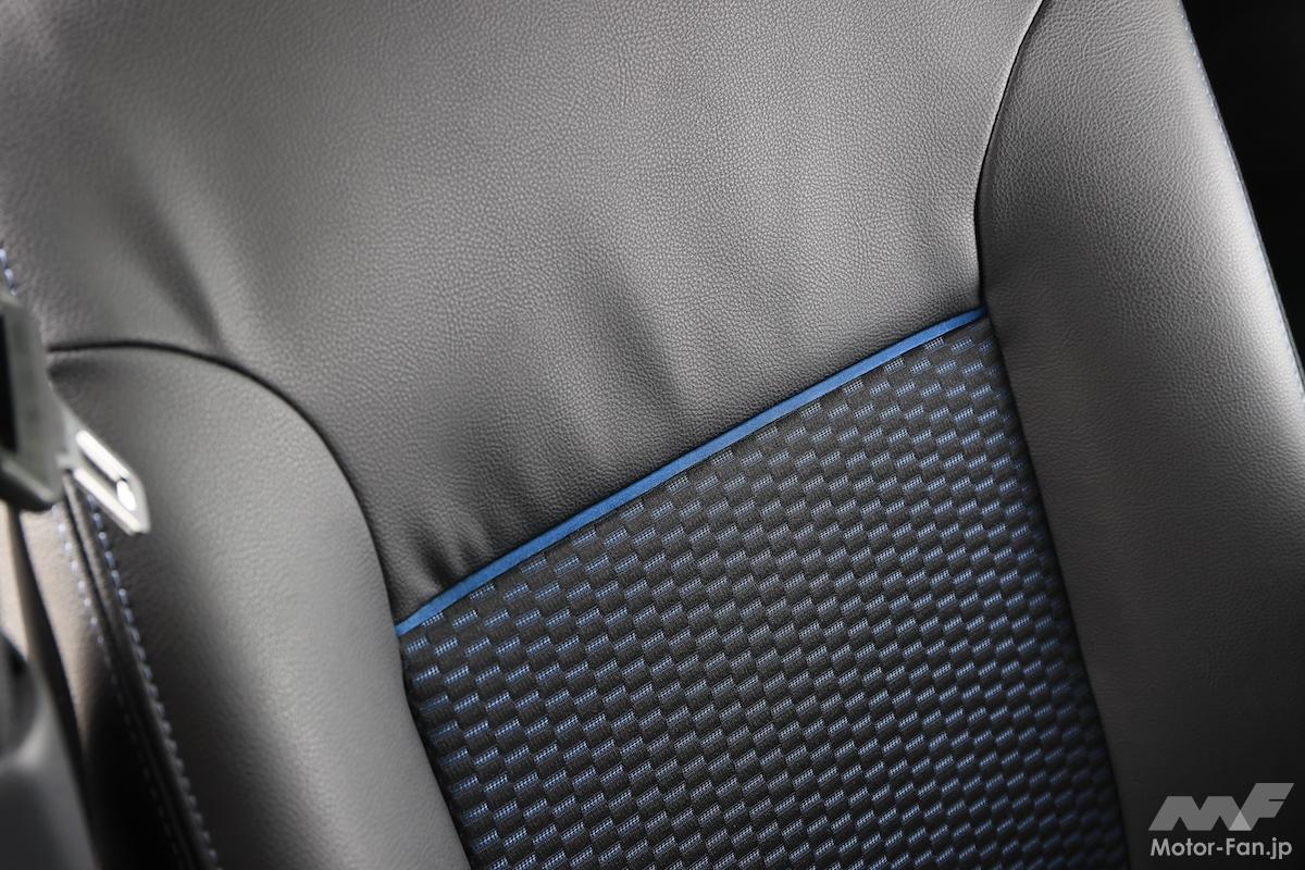 前後シートは表皮をレザー調とファブリックの組み合わせとし、フロントシートはレザーの面積を増やすとともにブルーのラインをアクセントにしている。ステッチもブルーとしてさりげない上質さを演出、ファブリック地の模様も印象的だ。