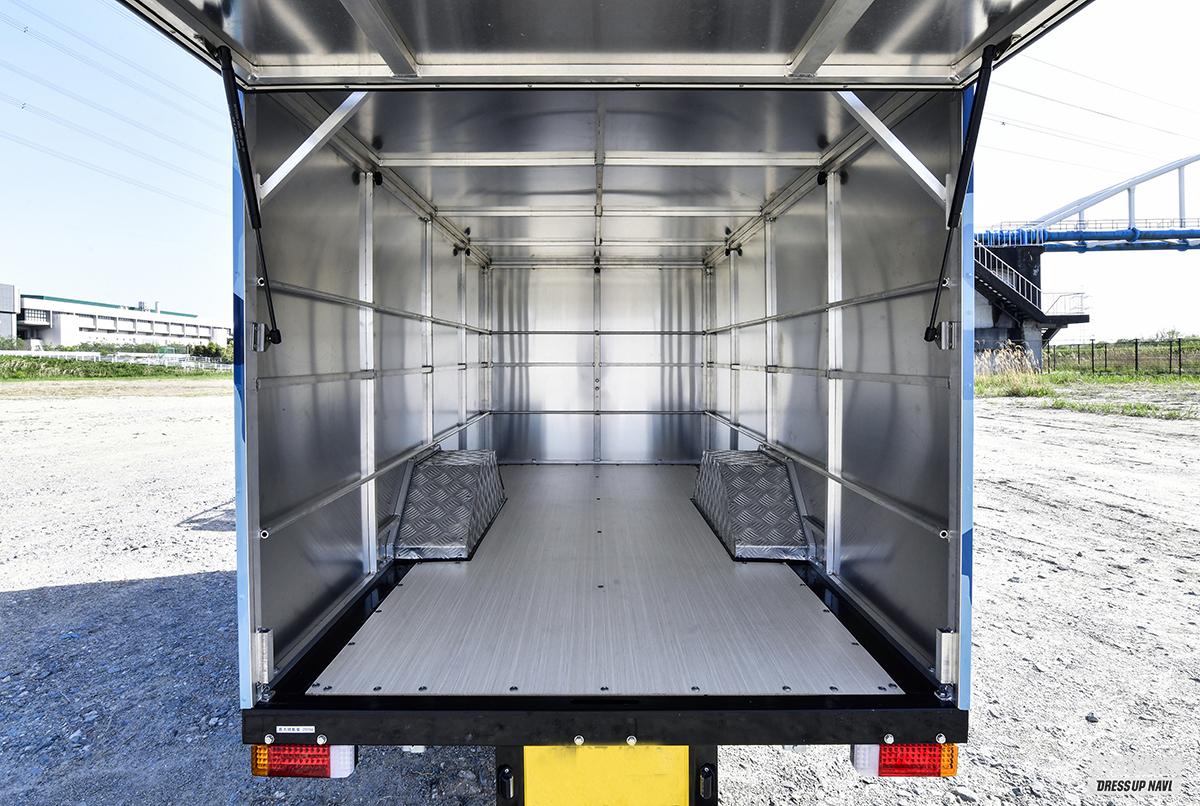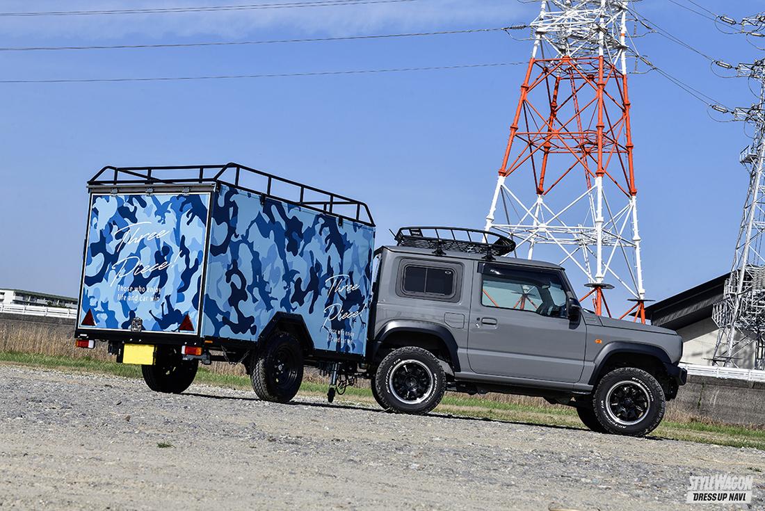 もう1台のジムニーもブラストカーゴをけん引しているが、こちらは個性豊かなブルーの迷彩シートでラッピング。スペアタイヤやオーバーフェンダーが標準装備となるなどそのままでもカッコいいが、「やはりカスタムショップなので、今後はタイヤ&ホイールを交換する予定です」。見た目のインパクトばかりに目が行ってしまうが、内部はかなり広い。キャンプ道具など多くの荷物を積み込める。