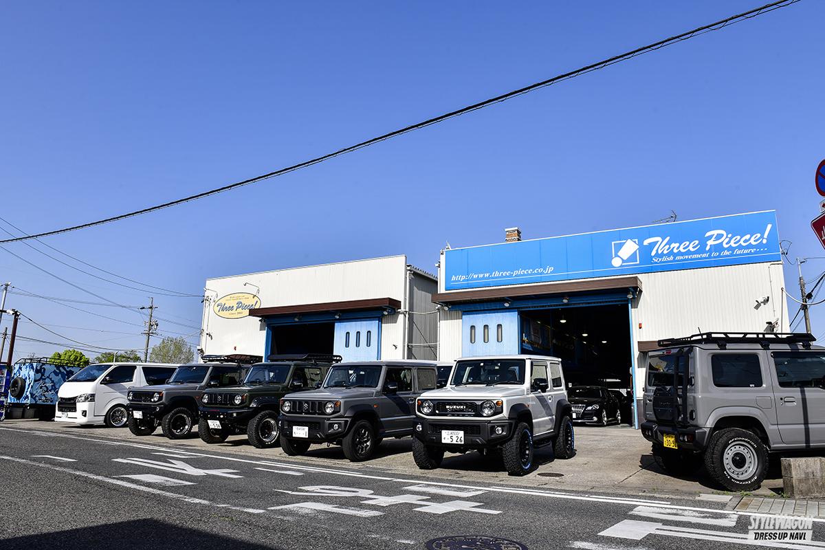 愛知県刈谷市のスリーピースは、東海地方を代表するカスタマイズプロショップとして知られている。セダンやミニバン、軽カーなどオールジャンルに対応しており、最近では200ハイエースにも力を入れている。そして今が旬のオフロード車、ジムニーのカスタマイズにも積極的。ただジムニー専門店ではないから想像しているよりも敷居はかなり低いし、どんな小さな悩みでも気軽に話を聞いてくれる。だからベテランユーザーはもちろんのこと、ジムニーを買ってこれからカスタマイズを考えている初心者は特に大歓迎というスタンス。
