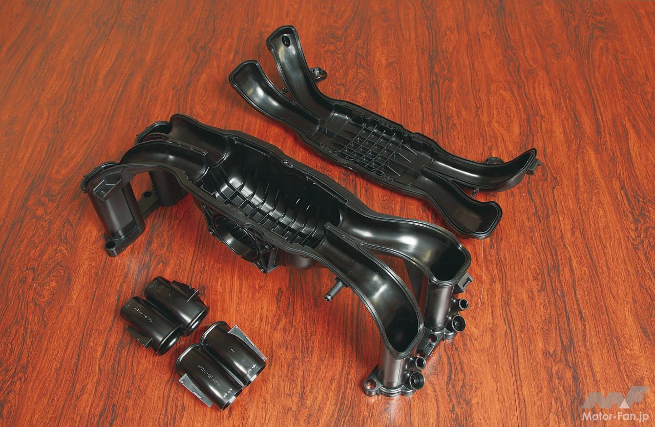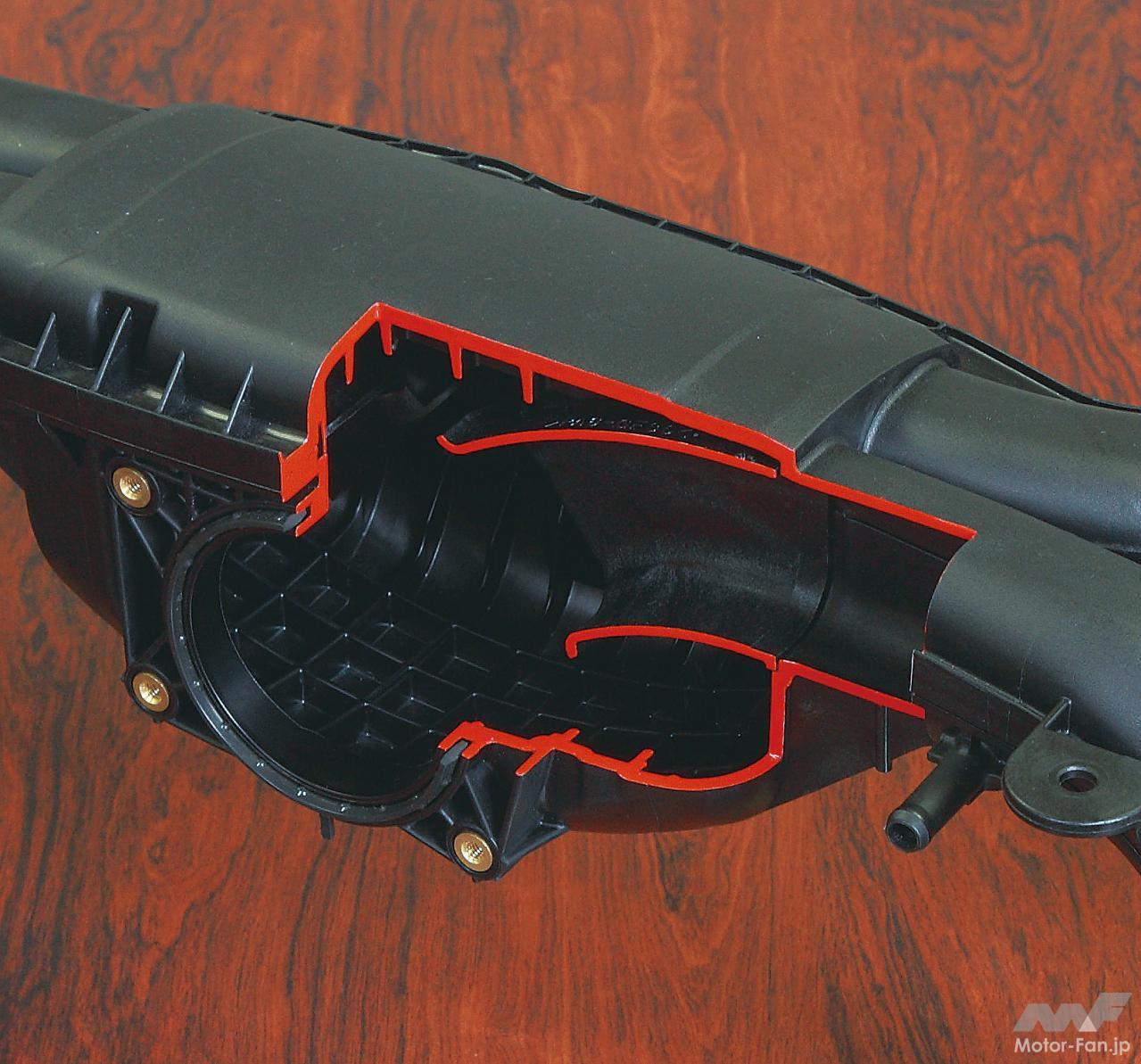 今日の技術をもってすれば、金属製でもかなり複雑な形状の成形が可能だが、工程中で消失するタイプの中子が必要になったりと、コストが高騰しがち。その点では樹脂品が断然優位だし、肉厚のコントロールなども容易だ。また、一般に樹脂は金属に比べて断熱効果が高く、吸気温度を低く保ちやすいメリットもある。